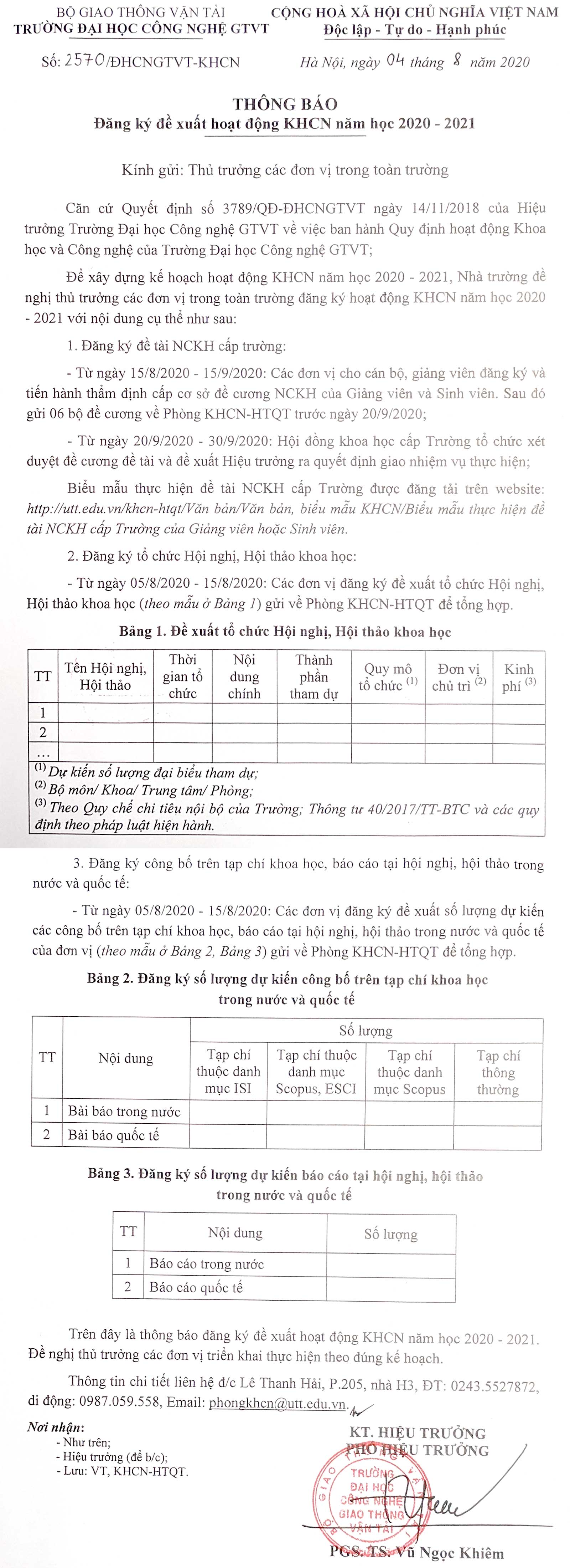 Thông báo Đăng ký đề xuất hoạt động KHCN năm học 2020-2021
