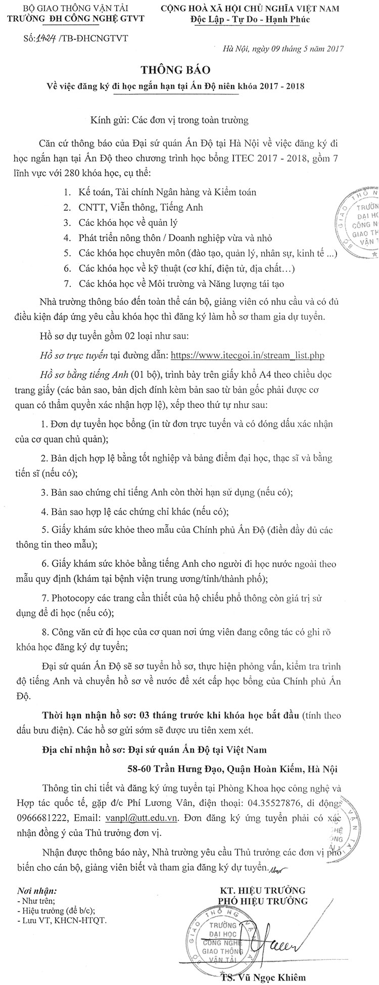 Thông báo Đăng ký đi học ngắn hạn tại Ấn Độ niên khóa 2017 - 2018