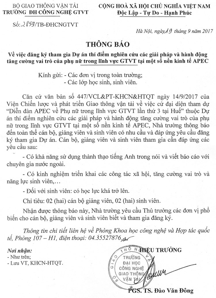 Thông báo đăng ký tham gia Dự án thí điểm nghiên cứu các giải pháp và hành động tăng cường vai trò của phụ nữ trong lĩnh vực GTVT tại một số nền kinh tế APEC 21/09/2017 16:09