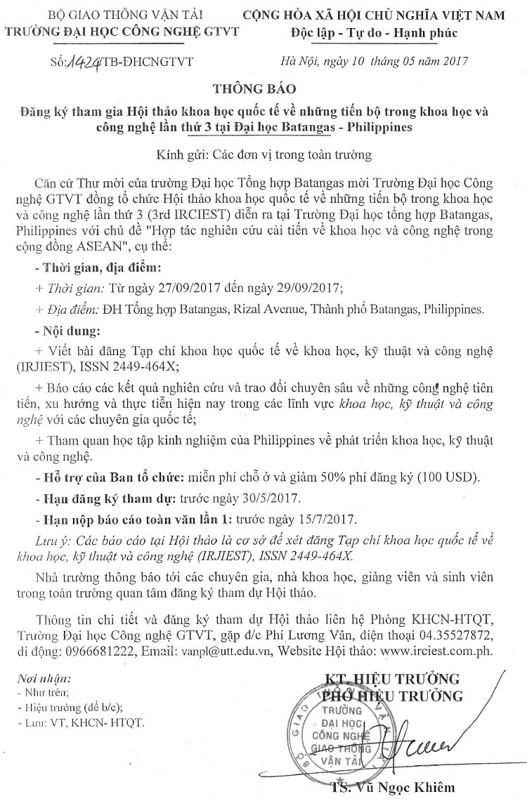Thông báo Đăng ký tham gia Hội thảo khoa học quốc tế về những tiến bộ trong khoa học và công nghệ lần thứ 3 tại Đại học Batangas - Philippines 17/05/2017 15:05 File đính kèm irciest_full_paper_format.docx irciest_criteria_for_paper_review.docx Tin liên quan Thông báo về việc đăng ký tham dự Hội thảo “Cùng nhau vươn lên: Kỹ năng lãnh đạo cho tương lai của giáo dục đại học tại Việt Nam và Đông Nam Á” 12/11/2025 Thông báo về việc cập nhật thông tin Căn cước công dân cho người phụ thuộc 30/10/2025 Kế hoạch tổ chức Toạ đàm khoa học “Vai trò của Trí tuệ nhân tạo và công nghệ mới trong nâng cao hiệu quả nghiên cứu lĩnh vực tài chính kế toán” 24/10/2025 Thông báo về việc cử cán bộ tham gia khóa bồi dưỡng tại Học viện Ngoại giao 20/10/2025 Về việc lấy ý kiến góp ý vào dự thảo Quyết định ban hành Quy định về công tác thi đua, khen thưởng của Trường Đại học Công nghệ GTVT 09/10/2025 Thông báo về việc thống kê khối lượng hoạt động phục vụ cộng đồng của giảng viên năm học 2024-2025 02/10/2025