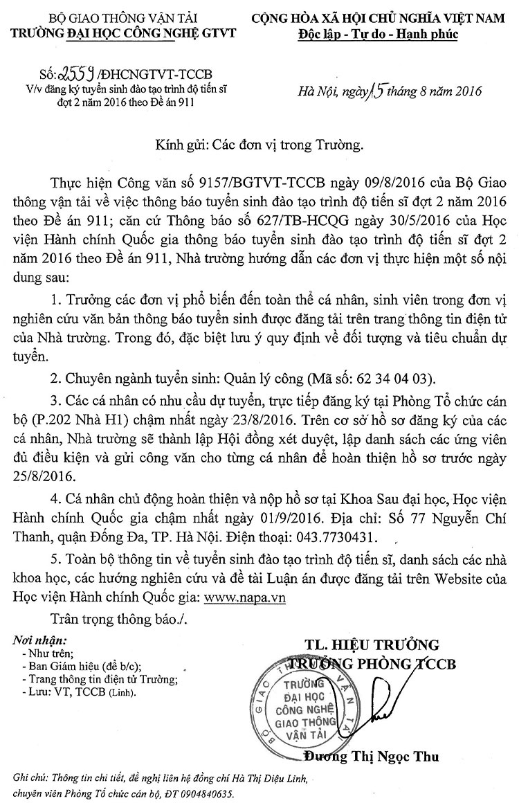 Thông báo đăng ký tuyển sinh đào tạo trình độ tiến sĩ đợt 2 năm 2016 theo Đề án 911 15/08/2016 16:08 File đính kèm 09.08.2016-9157.pdf