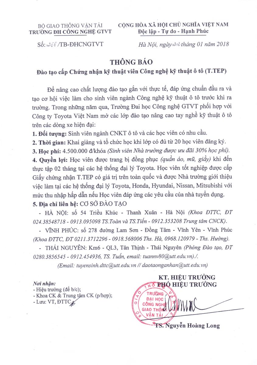 Thông báo đào tạo cấp Chứng nhận kỹ thuật viên Công nghệ kỹ thuật Ô tô (T.TEP)