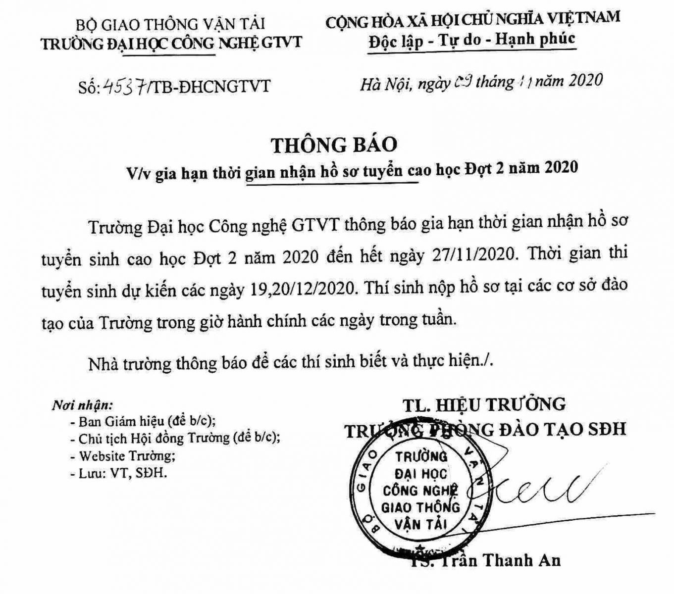 Thông báo gia hạn thời gian nhận hồ sơ tuyển cao học Đợt 2 năm 2020 12/11/2020 08:11 File đính kèm 1.-Danh-muc-ho-so-dang-ky-du-thi.pdf 2.-Phu-luc-2-2020.pdf 0.-Thong-bao-thac-si-2-2020.pdf 3.-Phieu-du-tuyen.docx 4.-Don-xin-du-tuyen.doc Lich-on-cao-hoc-2-2020.pdf Tin liên quan Thông báo về việc cập nhật thông tin Căn cước công dân cho người phụ thuộc 30/10/2025 Kế hoạch tổ chức Toạ đàm khoa học “Vai trò của Trí tuệ nhân tạo và công nghệ mới trong nâng cao hiệu quả nghiên cứu lĩnh vực tài chính kế toán” 24/10/2025 Thông báo về việc cử cán bộ tham gia khóa bồi dưỡng tại Học viện Ngoại giao 20/10/2025 Về việc lấy ý kiến góp ý vào dự thảo Quyết định ban hành Quy định về công tác thi đua, khen thưởng của Trường Đại học Công nghệ GTVT 09/10/2025 Thông báo về việc thống kê khối lượng hoạt động phục vụ cộng đồng của giảng viên năm học 2024-2025 02/10/2025 Kê khai khối lượng hoạt động khoa học và công nghệ phục vụ thanh toán khối lượng thừa giờ năm học 2024-2025 01/10/2025 Tin nổi bật UTT Awards 2025: Khi người học nói lời tri ân những người Tận tâm- Tận hiến vì UTT 29/10/2025 14:10 UTT ra mắt Mạng lưới trung tâm đào tạo xuất sắc và tài năng trong lĩnh vực Công nghệ giao thông và Hạ tầng tiên... 10/10/2025 13:10 Thông tin mới nhất Đại hội Hội Cựu chiến binh Trường Đại học Công nghệ Giao thông vận tải nhiệm kỳ 2025–2030 thành công tốt đẹp 04/11/2025 15:11 Sinh viên chuyên ngành Trí tuệ nhân tạo & Giao thông thông minh UTT: Kiến tạo tương lai cùng doanh nghiệp 04/11/2025 08:11 Vượt lên nghịch cảnh, em Trần Văn Dũng viết tiếp ước mơ khi đến với Trường Đại học Công nghệ GTVT 03/11/2025 14:11 UTT thúc đẩy hợp tác với các đối tác Úc trong đào tạo, nghiên cứu và hỗ trợ sinh viên 30/10/2025 15:10 Thông báo về việc cập nhật thông tin Căn cước công dân cho người phụ thuộc 30/10/2025 15:10
