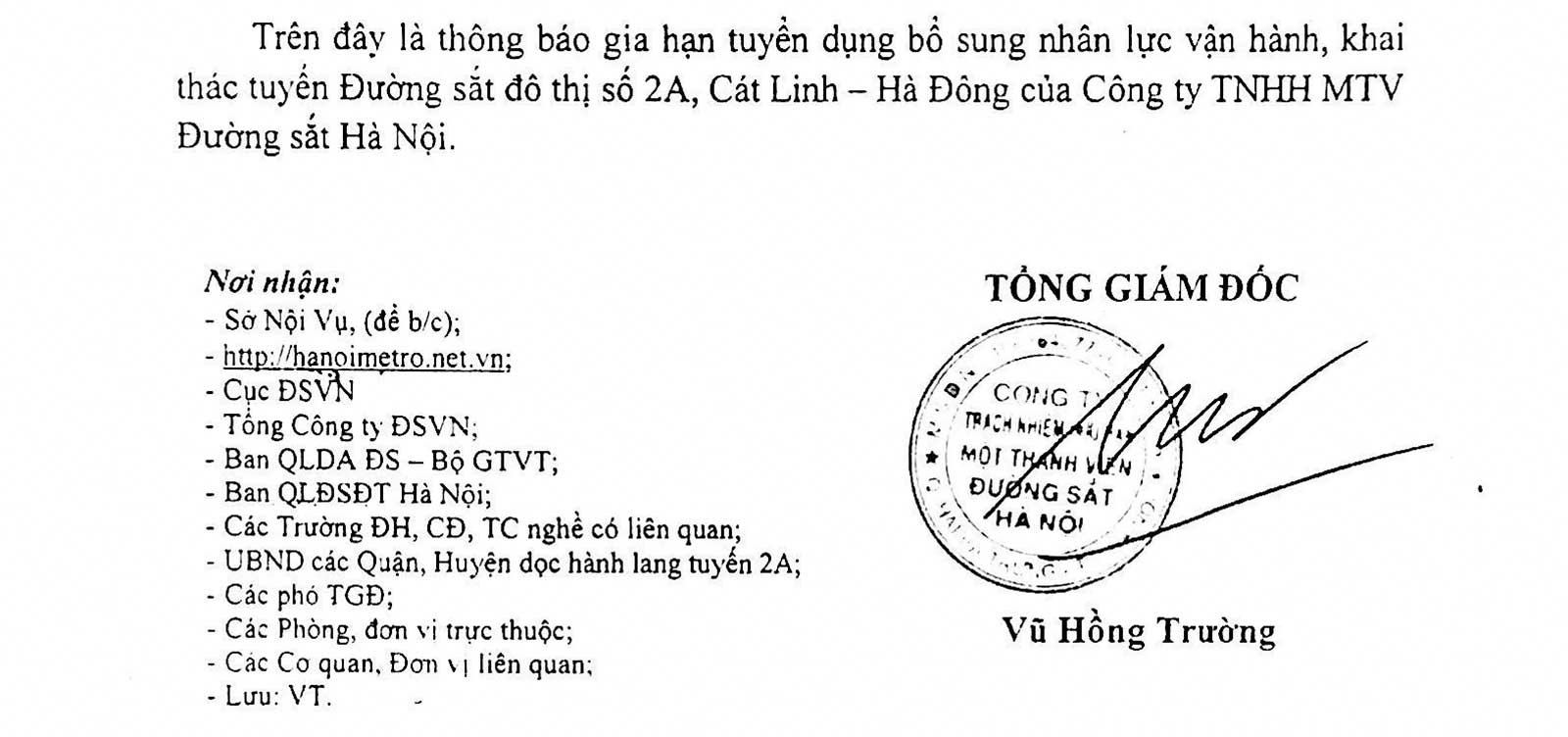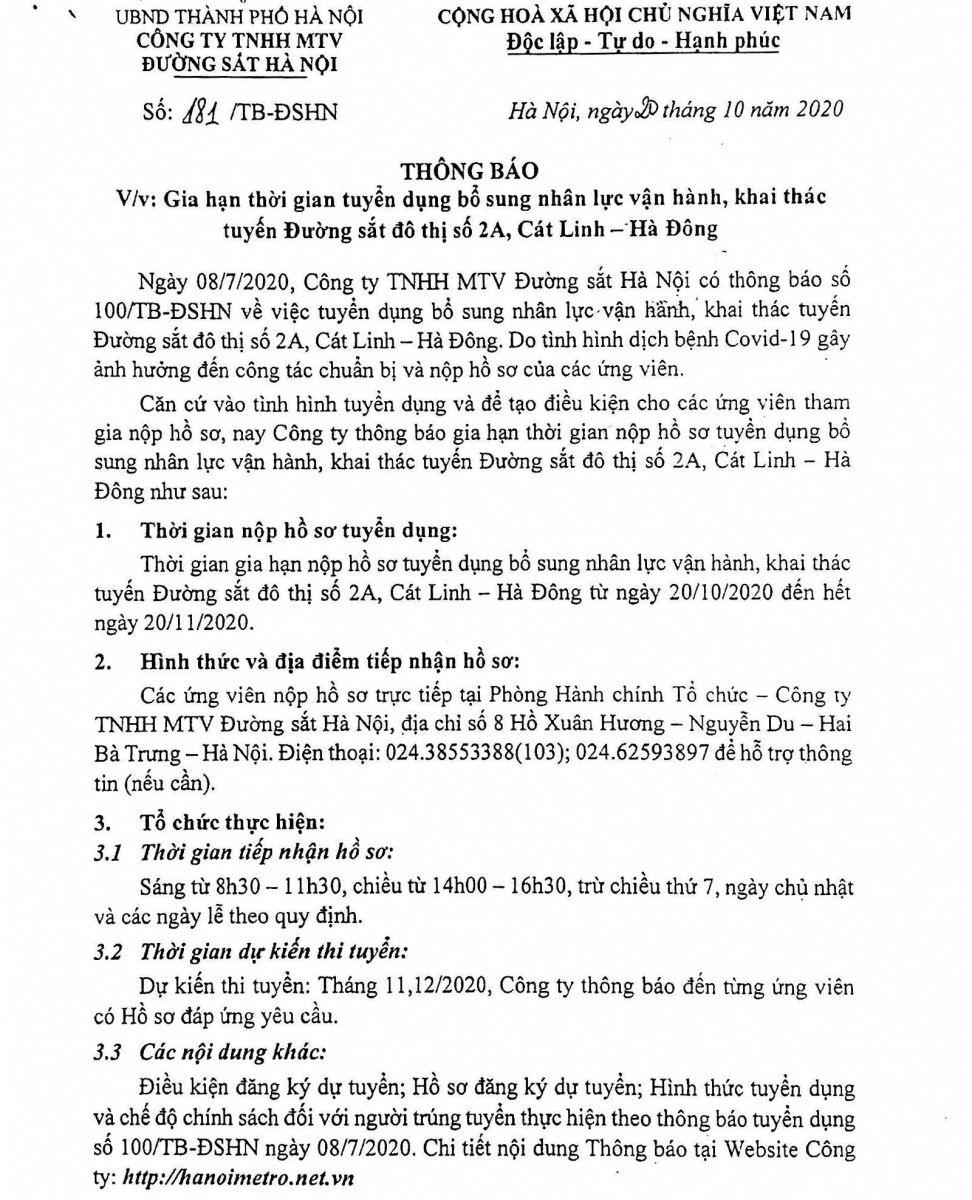 Thông báo Gia hạn thời gian tuyển dụng bổ sung nhân lực vận hành, khai thác tuyến Đường sắt đô thị số 2A, Cát Linh - Hà Đông 27/10/2020 03:10