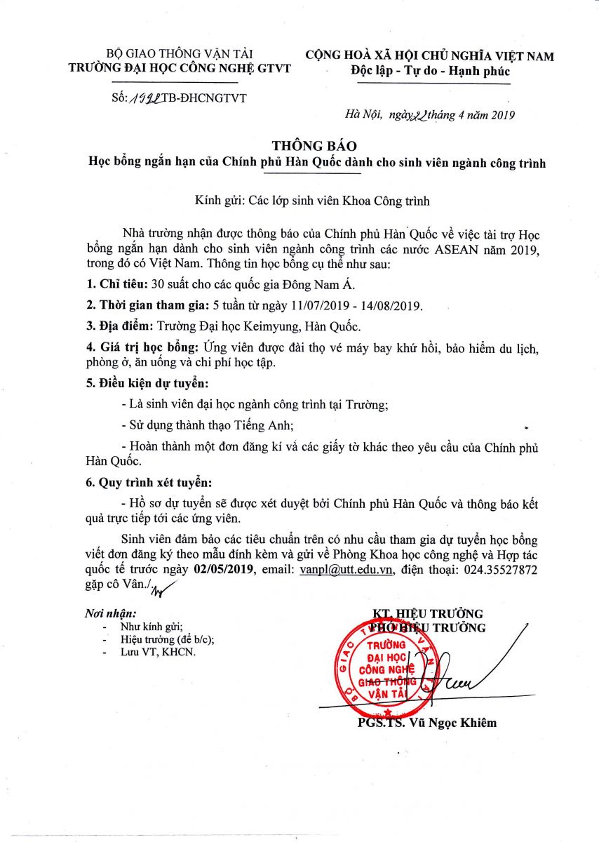 Thông báo học bổng ngắn hạn của Chính phủ Hàn quốc dành cho sinh viên ngành công trình 22/04/2019 10:04 File đính kèm hoc-bong-han-quoc.pdf