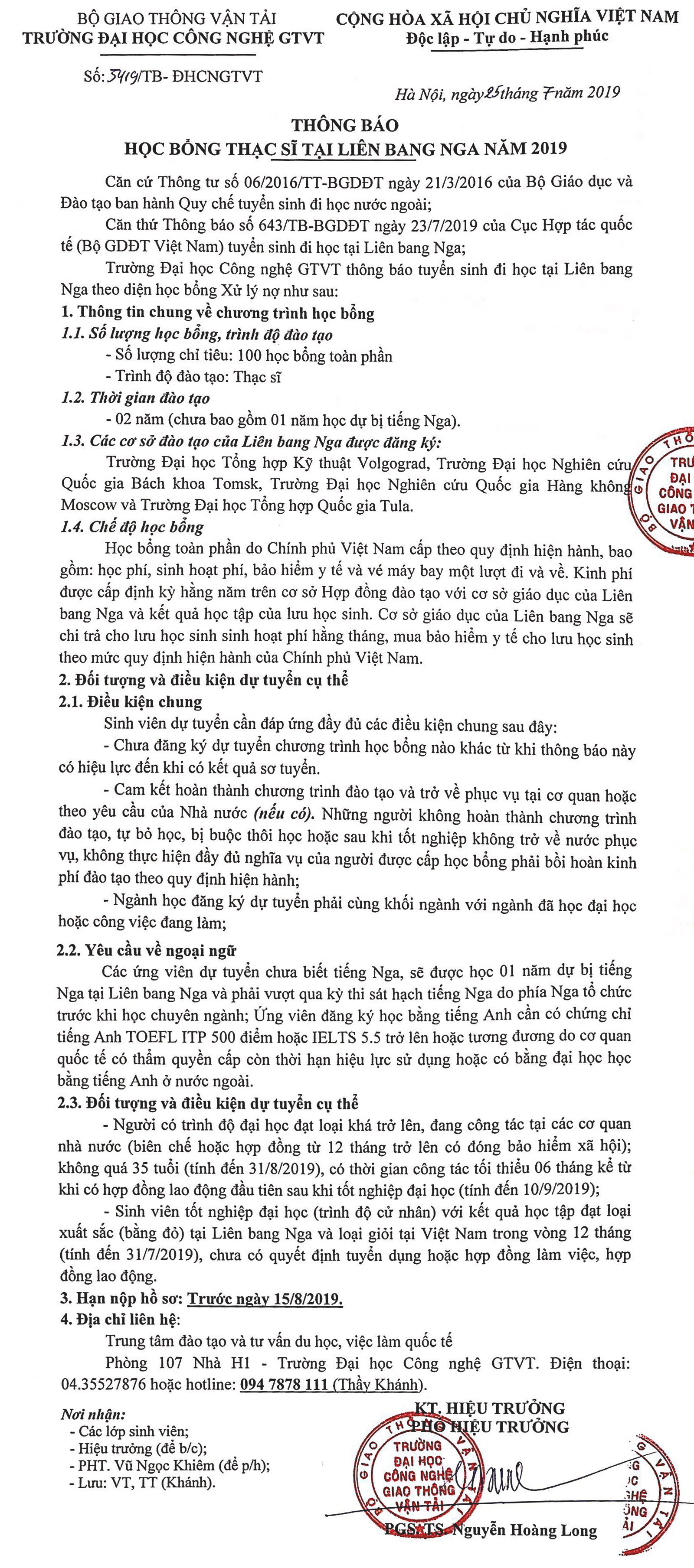 Thông báo Học bổng Thạc sĩ tại Liên Bang Nga năm 2019