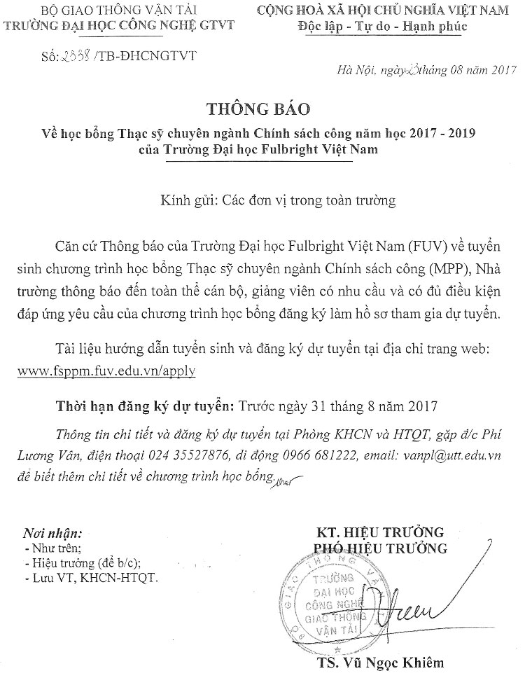 Thông báo học bổng Thạc sỹ chuyên ngành Chính sách công năm học 2017 - 2019 của Trường Đại học Fulbright Việt Nam 23/08/2017 16:08