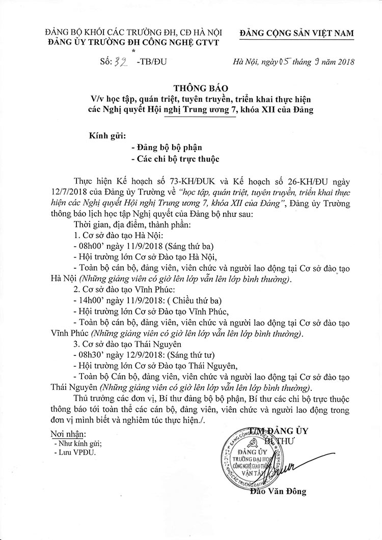 Thông báo học tập, quán triệt, tuyên truyền, triển khai thực hiện các Nghị quyết Hội nghị Trung ương 7, khóa XII của Đảng 05/09/2018 11:09