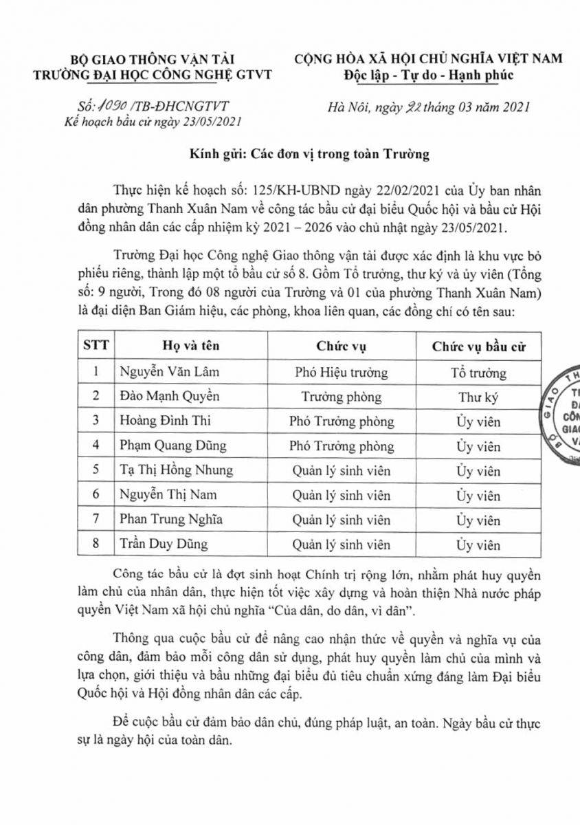 Thông báo kế hoạch bầu cử ngày 23/05/2021