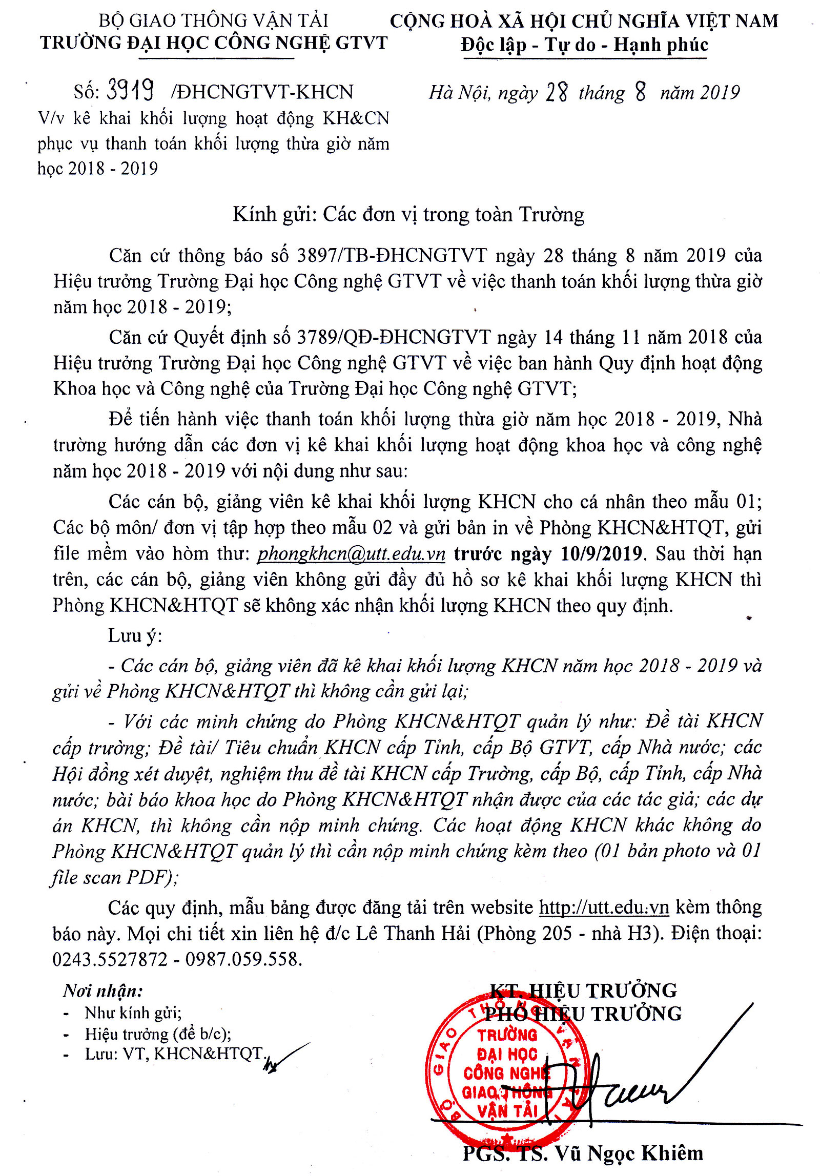 Thông báo Kê khai khối lượng hoạt động KH&CN phục vụ thanh toán khối lượng thừa giờ năm học 2018-2019 29/08/2019 14:08 File đính kèm 1.Thong-bao-ke-khai-KL-KHCN-nam-2018-2019---Tinh-thua-gio.docx 2.Ke-khai-KLKH-nam-hoc-2018-2019.xls QD-3789---Quy-dinh-Hoat-dong-KHCN-UTT.pdf Tin liên quan Thông báo về việc cập nhật thông tin Căn cước công dân cho người phụ thuộc 30/10/2025 Kế hoạch tổ chức Toạ đàm khoa học “Vai trò của Trí tuệ nhân tạo và công nghệ mới trong nâng cao hiệu quả nghiên cứu lĩnh vực tài chính kế toán” 24/10/2025 Thông báo về việc cử cán bộ tham gia khóa bồi dưỡng tại Học viện Ngoại giao 20/10/2025 Về việc lấy ý kiến góp ý vào dự thảo Quyết định ban hành Quy định về công tác thi đua, khen thưởng của Trường Đại học Công nghệ GTVT 09/10/2025 Thông báo về việc thống kê khối lượng hoạt động phục vụ cộng đồng của giảng viên năm học 2024-2025 02/10/2025 Kê khai khối lượng hoạt động khoa học và công nghệ phục vụ thanh toán khối lượng thừa giờ năm học 2024-2025 01/10/2025