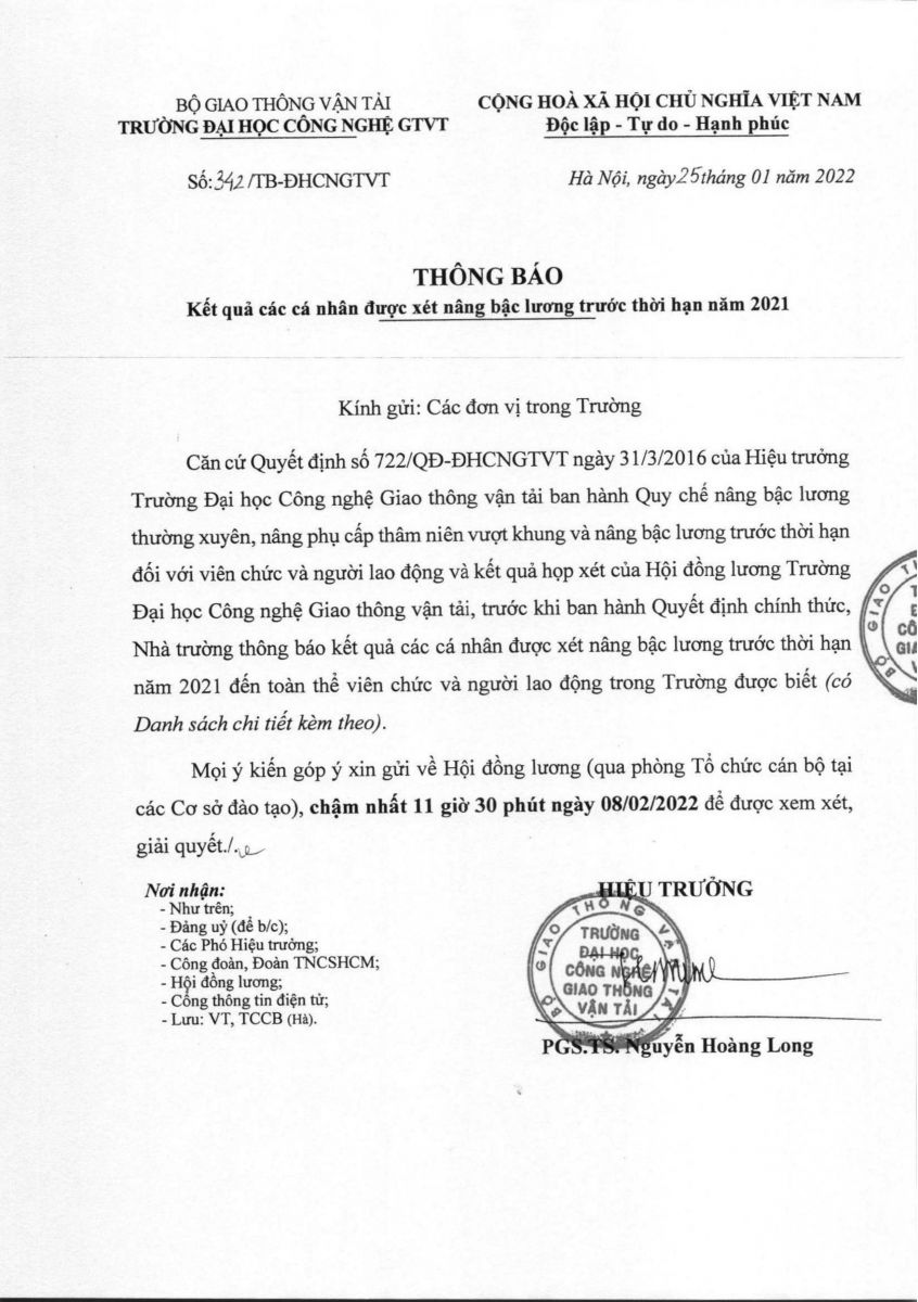 Thông báo kết quả các cá nhân được xét nâng lương trước thời hạn 2021 26/01/2022 14:01 File đính kèm 342-TB-DHCNGTVT.pdf