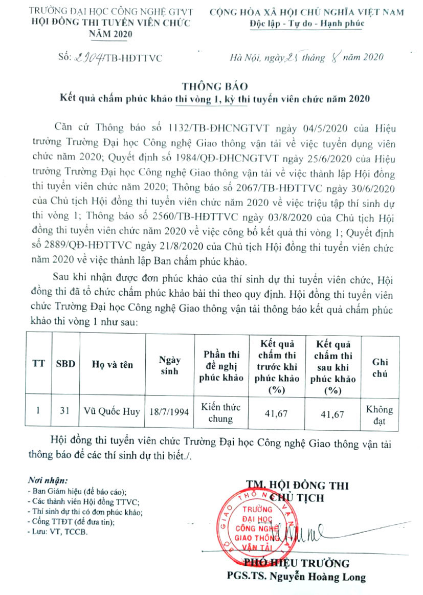 Thông báo Kết quả chấm phúc khảo thi vòng 1, kỳ thi tuyển viên chức năm 2020