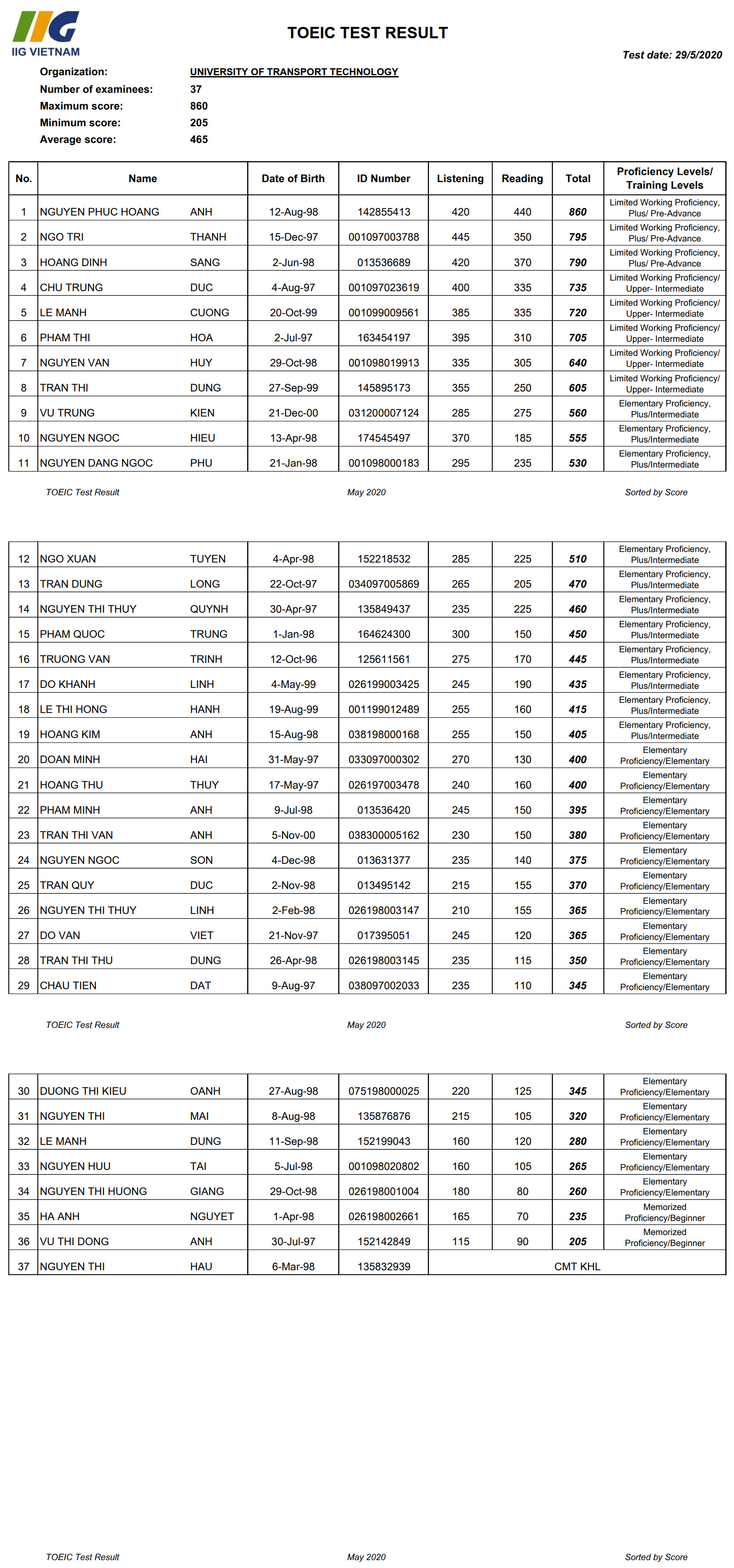 THÔNG BÁO KẾT QUẢ THI TOEIC NGÀY 29/5/2020 TẠI TRƯỜNG ĐH CÔNG NGHỆ GIAO THÔNG VẬN TẢI