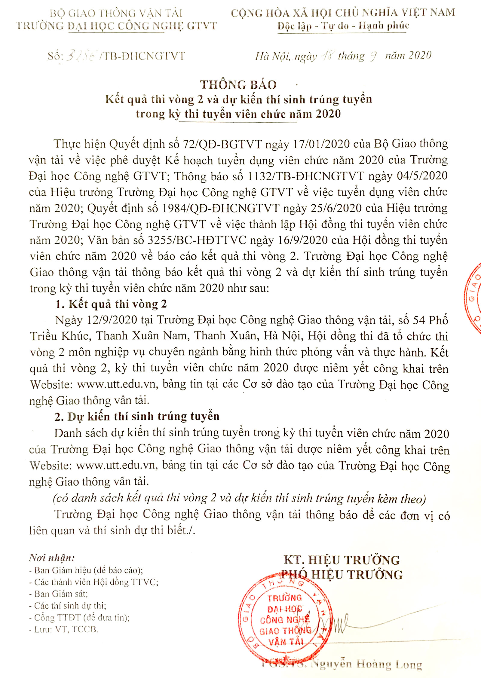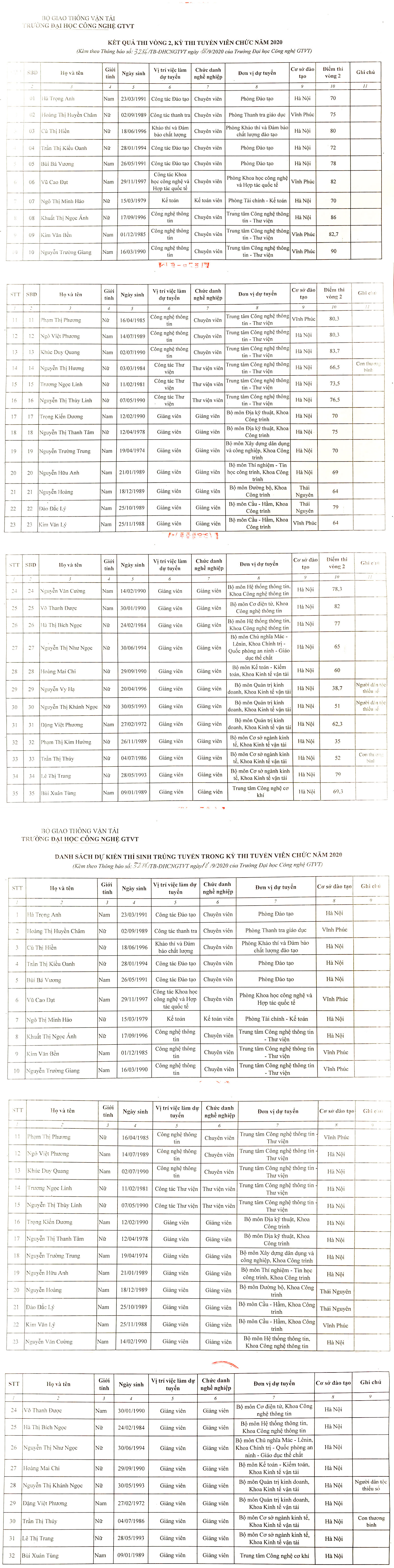 Thông báo Kết quả thi vòng 2 và dự kiến thí sinh trúng tuyển trong kỳ thi tuyển viên chức năm 2020 21/09/2020 08:09 File đính kèm 3286.pdf danh-sach-ket-qua-vien-chuc-2020.pdf Tin liên quan Thông báo về việc cập nhật thông tin Căn cước công dân cho người phụ thuộc 30/10/2025 Kế hoạch tổ chức Toạ đàm khoa học “Vai trò của Trí tuệ nhân tạo và công nghệ mới trong nâng cao hiệu quả nghiên cứu lĩnh vực tài chính kế toán” 24/10/2025 Thông báo về việc cử cán bộ tham gia khóa bồi dưỡng tại Học viện Ngoại giao 20/10/2025 Về việc lấy ý kiến góp ý vào dự thảo Quyết định ban hành Quy định về công tác thi đua, khen thưởng của Trường Đại học Công nghệ GTVT 09/10/2025 Thông báo về việc thống kê khối lượng hoạt động phục vụ cộng đồng của giảng viên năm học 2024-2025 02/10/2025 Kê khai khối lượng hoạt động khoa học và công nghệ phục vụ thanh toán khối lượng thừa giờ năm học 2024-2025 01/10/2025