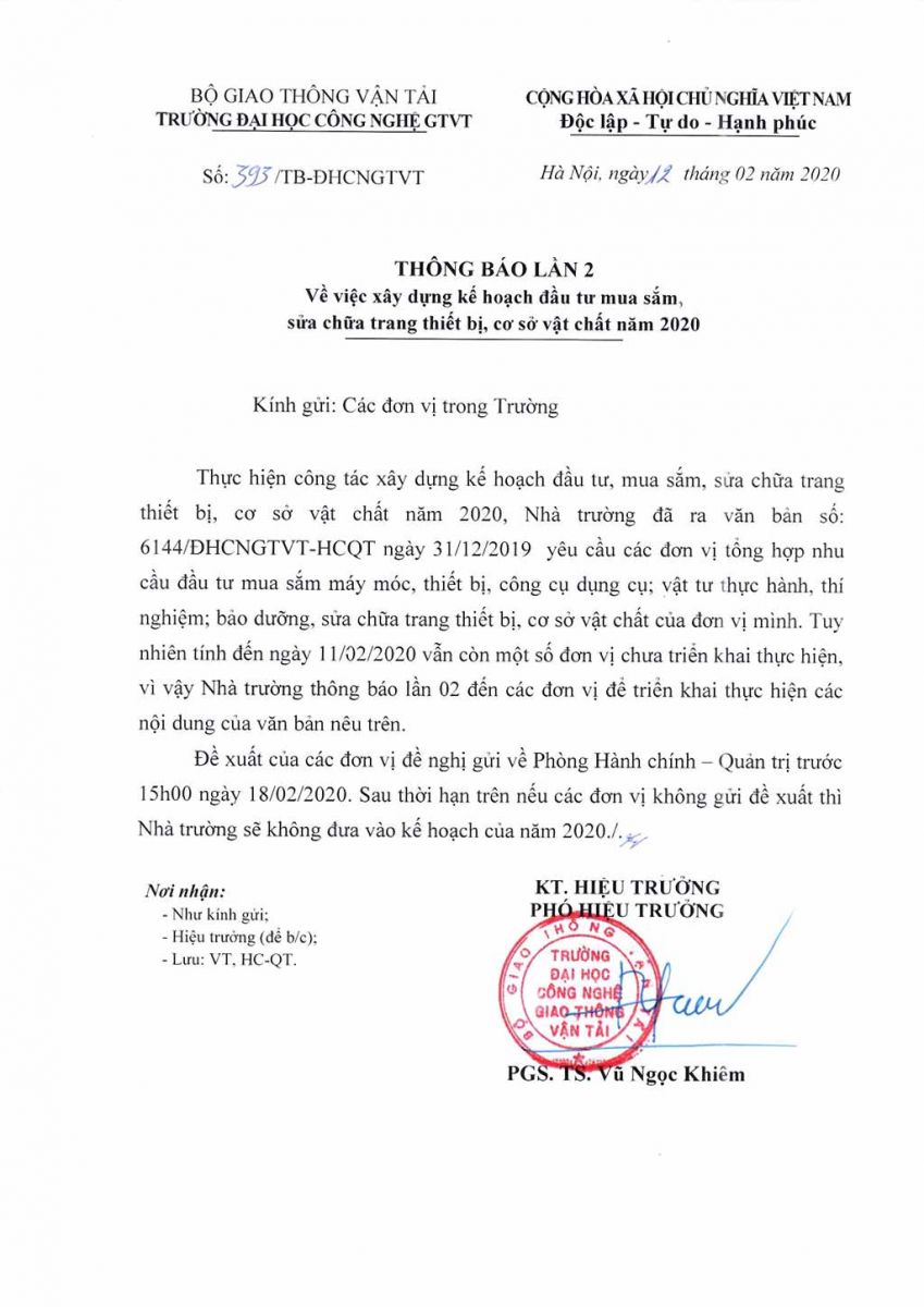 Thông báo lần 2 về việc xây dựng kế hoạch đầu tư mua sắm, sửa chữa trang thiết bị, cơ sở vật chất năm 2020 12/02/2020 08:02