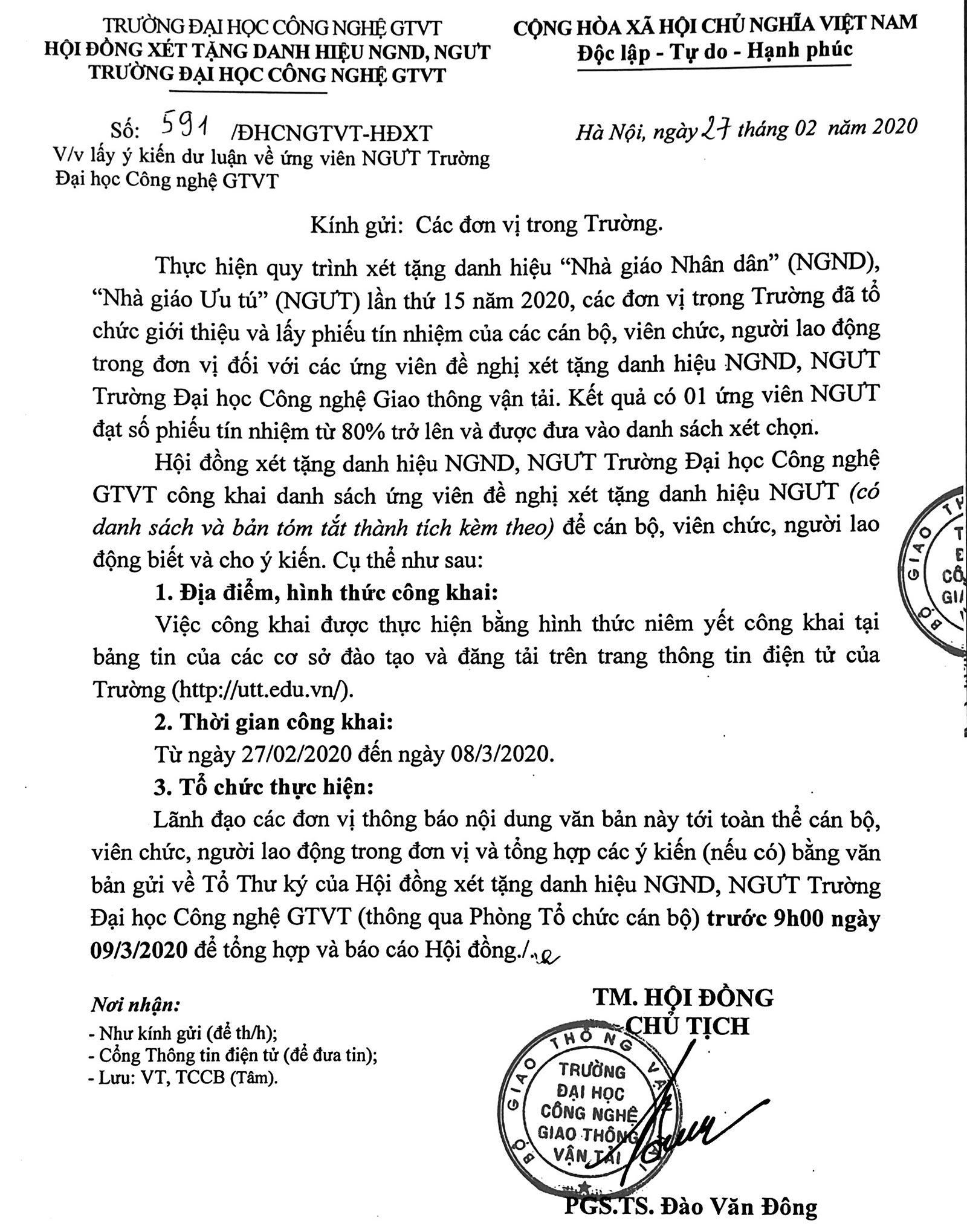 Thông báo Lấy ý kiến dư luận về ứng viên NGƯT Trường Đại học Công nghệ GTVT 27/02/2020 12:02 File đính kèm 591-01.pdf 591-00.pdf 591-02.pdf Tin liên quan Thông báo về việc cập nhật thông tin Căn cước công dân cho người phụ thuộc 30/10/2025 Kế hoạch tổ chức Toạ đàm khoa học “Vai trò của Trí tuệ nhân tạo và công nghệ mới trong nâng cao hiệu quả nghiên cứu lĩnh vực tài chính kế toán” 24/10/2025 Thông báo về việc cử cán bộ tham gia khóa bồi dưỡng tại Học viện Ngoại giao 20/10/2025 Về việc lấy ý kiến góp ý vào dự thảo Quyết định ban hành Quy định về công tác thi đua, khen thưởng của Trường Đại học Công nghệ GTVT 09/10/2025 Thông báo về việc thống kê khối lượng hoạt động phục vụ cộng đồng của giảng viên năm học 2024-2025 02/10/2025 Kê khai khối lượng hoạt động khoa học và công nghệ phục vụ thanh toán khối lượng thừa giờ năm học 2024-2025 01/10/2025
