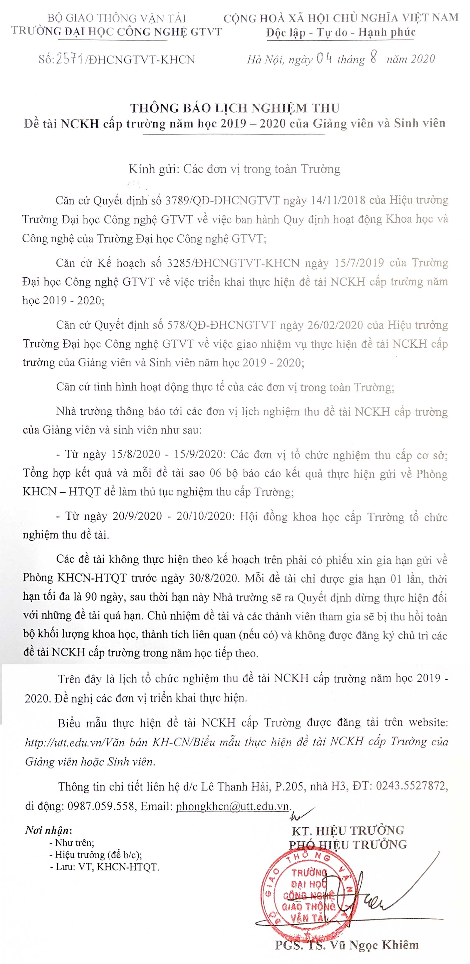 Thông báo lịch nghiệm thu Đề tài NCKH cấp trường năm học 2019-2020 của Giảng viên và Sinh viên 06/08/2020 01:08