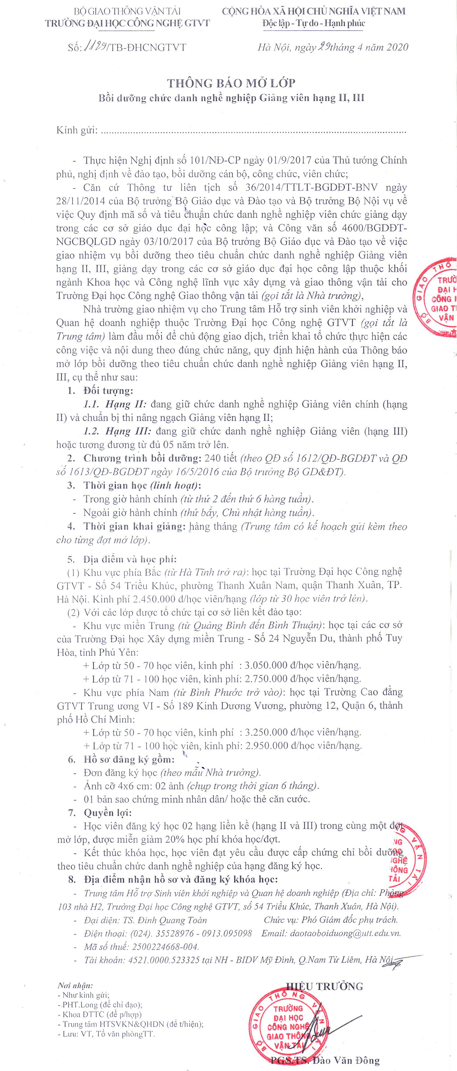 Thông báo mở lớp Bồi dưỡng chức danh nghề nghiệp Giảng viên hạng II, III 10/05/2020 14:05 File đính kèm Thong-bao-1129-DTBD-GV-hang-II-III--2020-.pdf