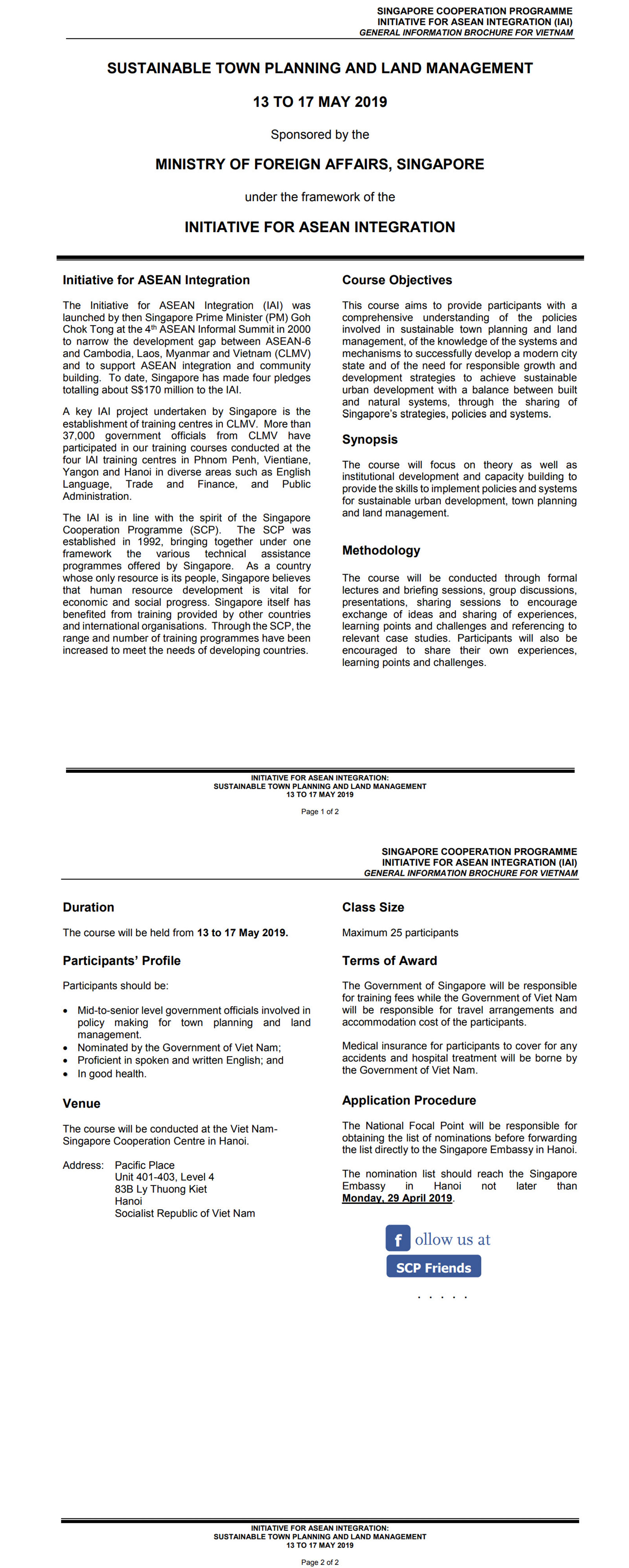 Thông báo mời tham gia Khóa đào tạo Quy hoạch đô thị bền vững và quản lý đất