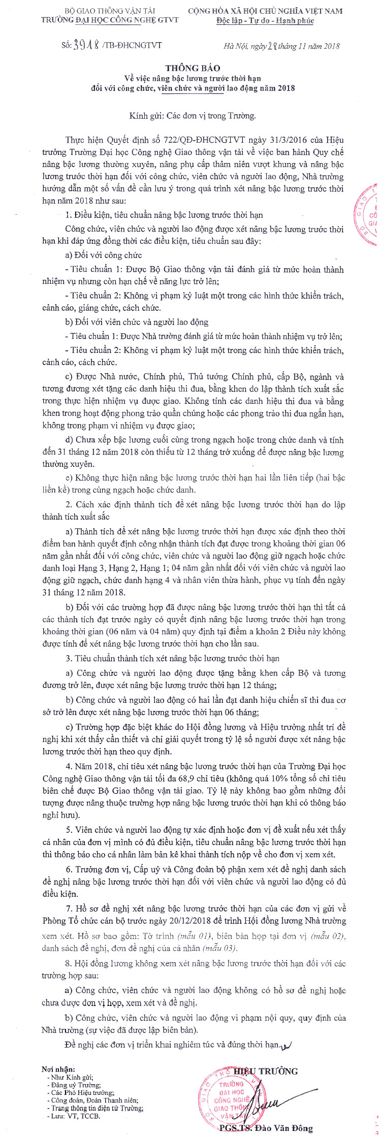 Thông báo nâng bậc lương trước thời hạn đối với công chức, viên chức và người lao động năm 2018 28/11/2018 16:11 File đính kèm 3918.pdf mau-bieu-nang-luong-Truoc-thoi-han-2018.doc Tin liên quan Thông báo về việc cập nhật thông tin Căn cước công dân cho người phụ thuộc 30/10/2025 Kế hoạch tổ chức Toạ đàm khoa học “Vai trò của Trí tuệ nhân tạo và công nghệ mới trong nâng cao hiệu quả nghiên cứu lĩnh vực tài chính kế toán” 24/10/2025 Thông báo về việc cử cán bộ tham gia khóa bồi dưỡng tại Học viện Ngoại giao 20/10/2025 Về việc lấy ý kiến góp ý vào dự thảo Quyết định ban hành Quy định về công tác thi đua, khen thưởng của Trường Đại học Công nghệ GTVT 09/10/2025 Thông báo về việc thống kê khối lượng hoạt động phục vụ cộng đồng của giảng viên năm học 2024-2025 02/10/2025 Kê khai khối lượng hoạt động khoa học và công nghệ phục vụ thanh toán khối lượng thừa giờ năm học 2024-2025 01/10/2025