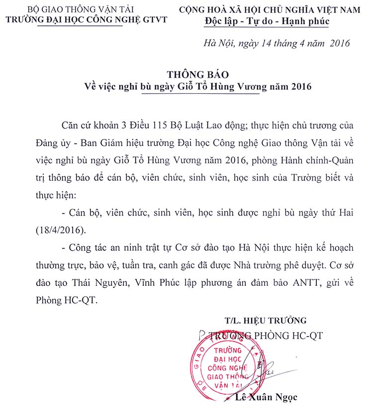 Thông báo nghỉ bù Ngày Giỗ Tổ Hùng Vương năm 2016