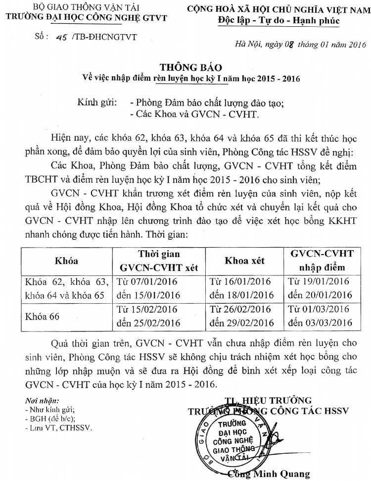 Thông báo nhập điểm rèn luyện học kỳ I năm học 2015 - 2016