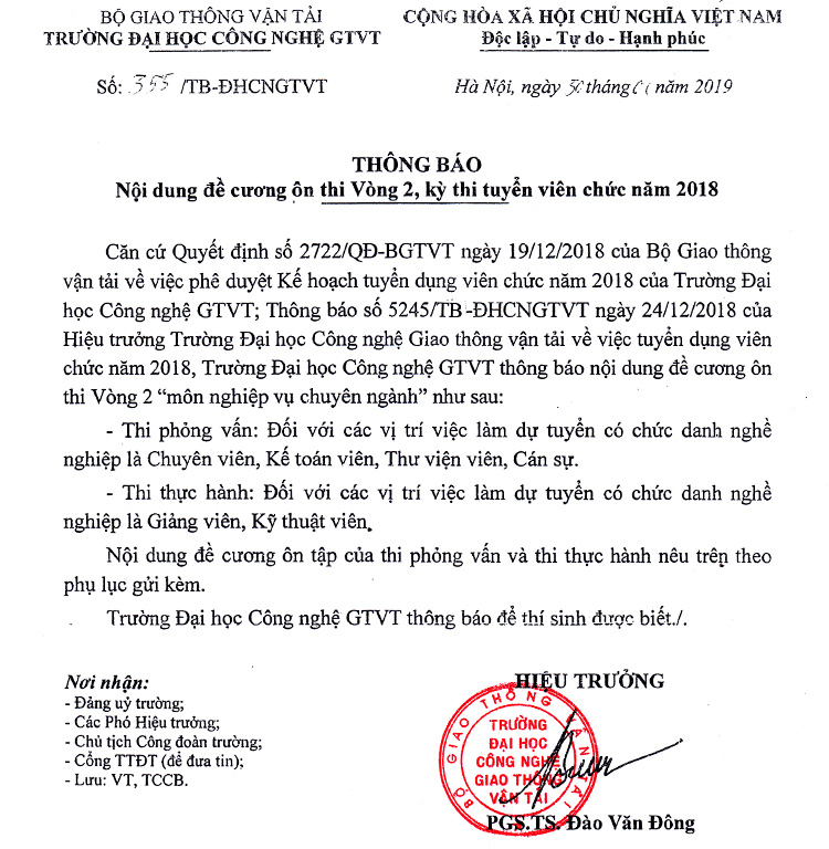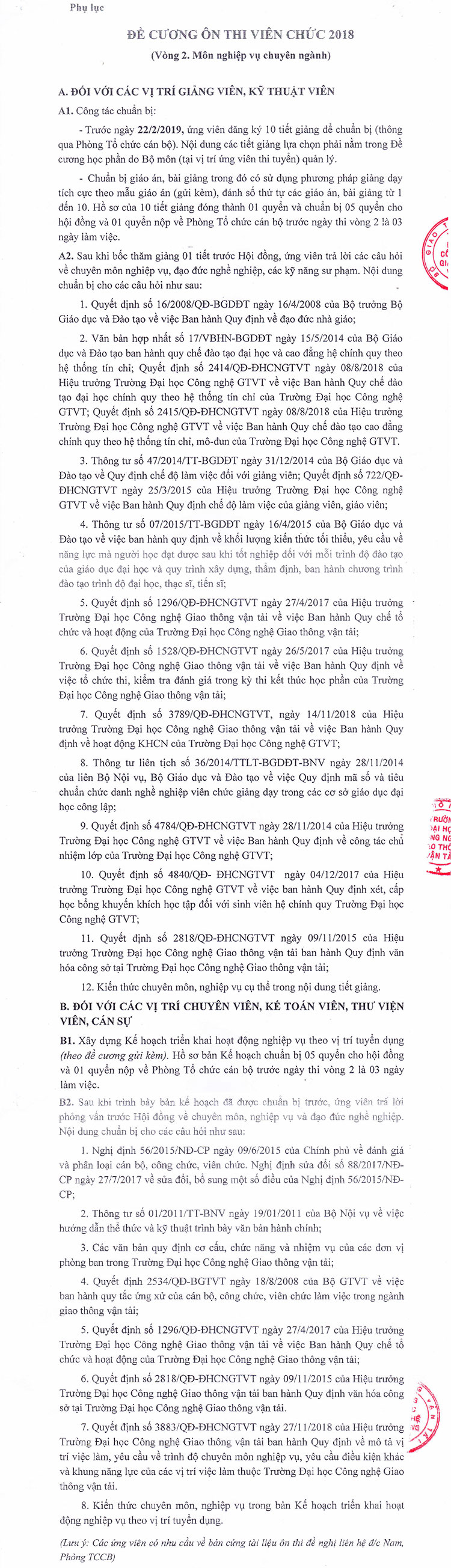 Thông báo Nội dung đề cương ôn thi Vòng 2, kỳ thi tuyển viên chức năm 2018 30/01/2019 13:01 File đính kèm De-cuong-Ke-hoach.doc De-cuong-vong-2--HT-.doc Mau-giao-an.doc Mot-so-tai-lieu-tham-khao.doc Tin liên quan Thông báo về việc cập nhật thông tin Căn cước công dân cho người phụ thuộc 30/10/2025 Kế hoạch tổ chức Toạ đàm khoa học “Vai trò của Trí tuệ nhân tạo và công nghệ mới trong nâng cao hiệu quả nghiên cứu lĩnh vực tài chính kế toán” 24/10/2025 Thông báo về việc cử cán bộ tham gia khóa bồi dưỡng tại Học viện Ngoại giao 20/10/2025 Về việc lấy ý kiến góp ý vào dự thảo Quyết định ban hành Quy định về công tác thi đua, khen thưởng của Trường Đại học Công nghệ GTVT 09/10/2025 Thông báo về việc thống kê khối lượng hoạt động phục vụ cộng đồng của giảng viên năm học 2024-2025 02/10/2025 Kê khai khối lượng hoạt động khoa học và công nghệ phục vụ thanh toán khối lượng thừa giờ năm học 2024-2025 01/10/2025 Tin nổi bật Bộ Xây dựng tổ chức Hội nghị công tác đào tạo khối các trường đại học thuộc Bộ 06/11/2025 17:11 UTT Awards 2025: Khi người học nói lời tri ân những người Tận tâm- Tận hiến vì UTT 29/10/2025 14:10 UTT ra mắt Mạng lưới trung tâm đào tạo xuất sắc và tài năng trong lĩnh vực Công nghệ giao thông và Hạ tầng tiên... 10/10/2025 13:10 Thông tin mới nhất Bộ Xây dựng tổ chức Hội nghị công tác đào tạo khối các trường đại học thuộc Bộ 06/11/2025 17:11 Đại hội Hội Cựu chiến binh Trường Đại học Công nghệ GTVT nhiệm kỳ 2025-2030 04/11/2025 15:11 Sinh viên chuyên ngành Trí tuệ nhân tạo & Giao thông thông minh UTT: Kiến tạo tương lai cùng doanh nghiệp 04/11/2025 08:11 Vượt lên nghịch cảnh, em Trần Văn Dũng viết tiếp ước mơ khi đến với Trường Đại học Công nghệ GTVT 03/11/2025 14:11 UTT thúc đẩy hợp tác với các đối tác Úc trong đào tạo, nghiên cứu và hỗ trợ sinh viên 30/10/2025 15:10