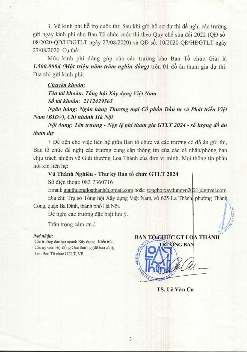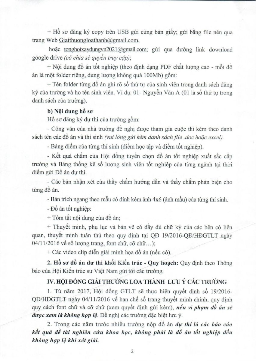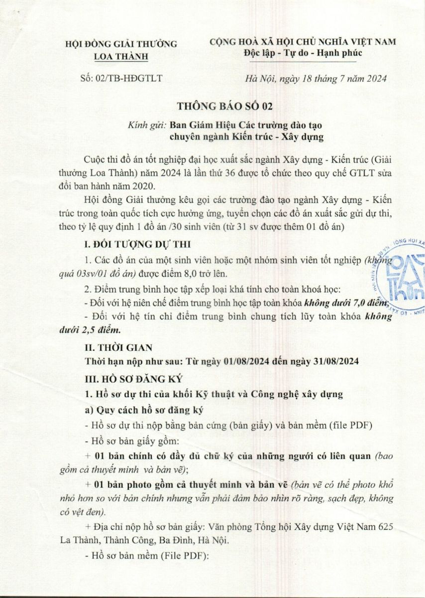 Thông báo số 02 của Hội đồng giải thưởng Loa Thành về Cuộc thi đồ án tốt nghiệp đại học xuất sắc ngành Xây dựng-Kiến trúc năm 2024 21/08/2024 16:08