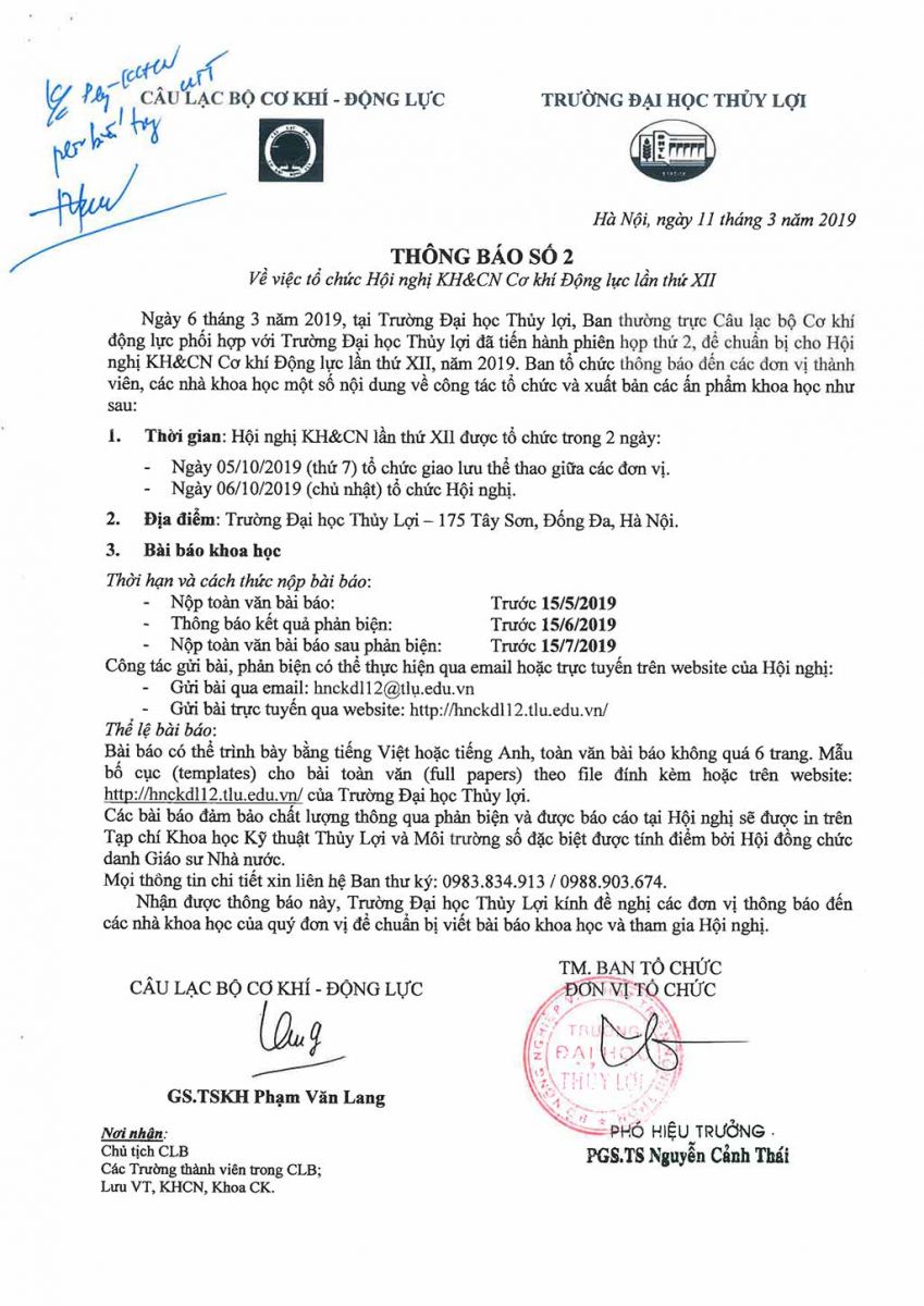 Thông báo số 2 về việc tổ chức Hội nghị KH&CN Cơ khí Động lực lần thứ XII