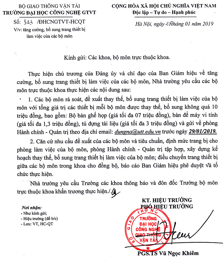 Thông báo tăng cường, bổ sung trang thiết bị làm việc của các bộ môn