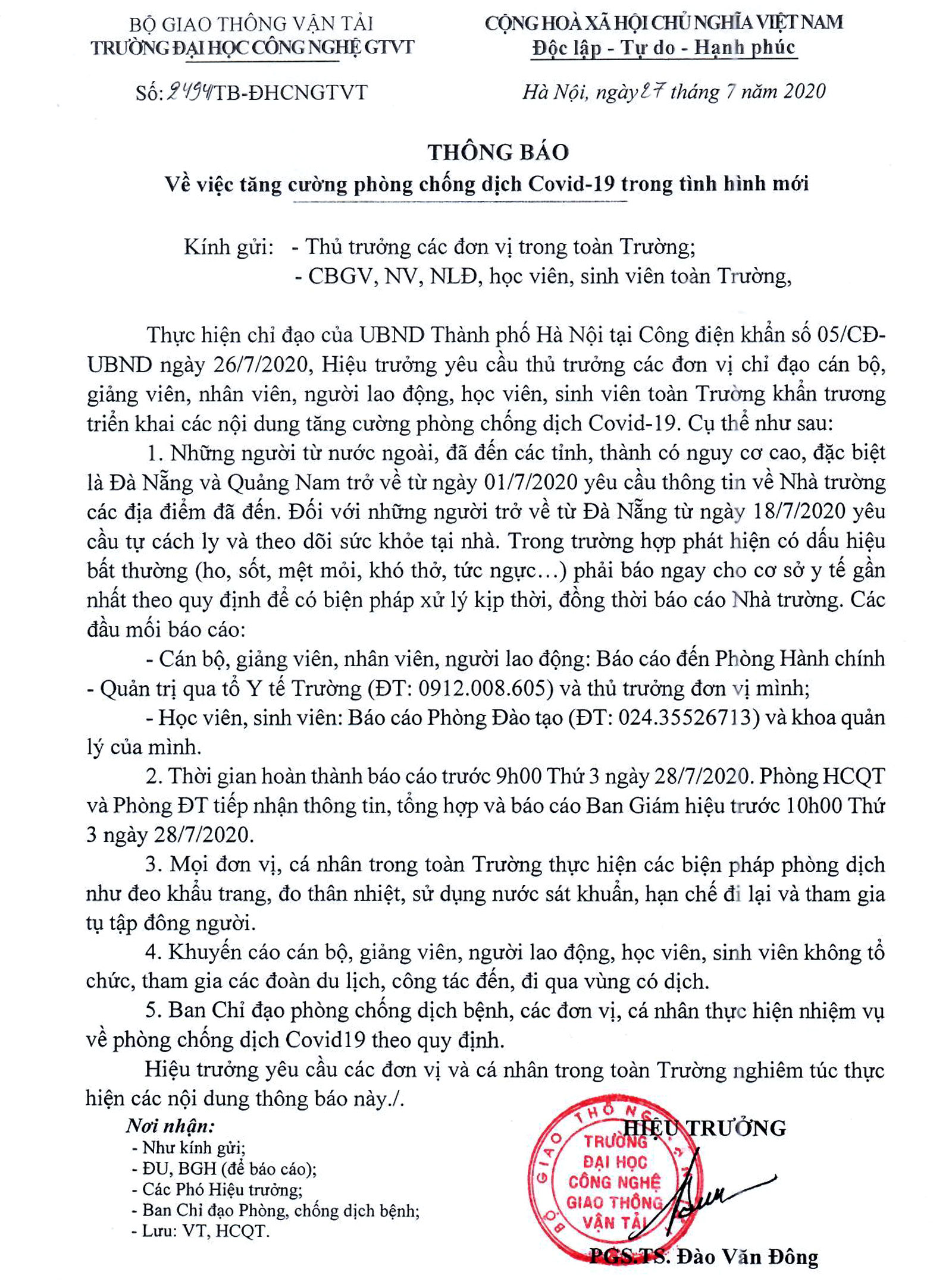 Thông báo tăng cường phòng chống dịch Covid-19 trong tình hình mới 27/07/2020 11:07 File đính kèm Covid-19.-7.2020_0001.pdf