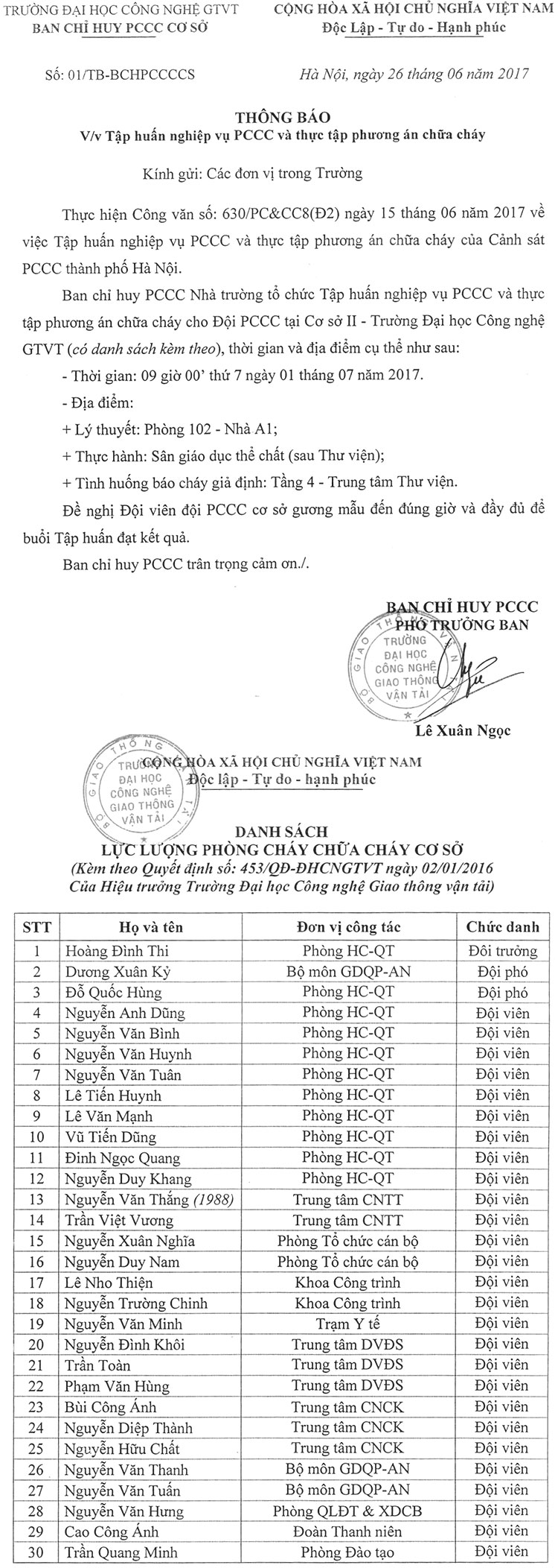 Thông báo Tập huấn nghiệp vụ PCCC và thực tập phương án chữa cháy