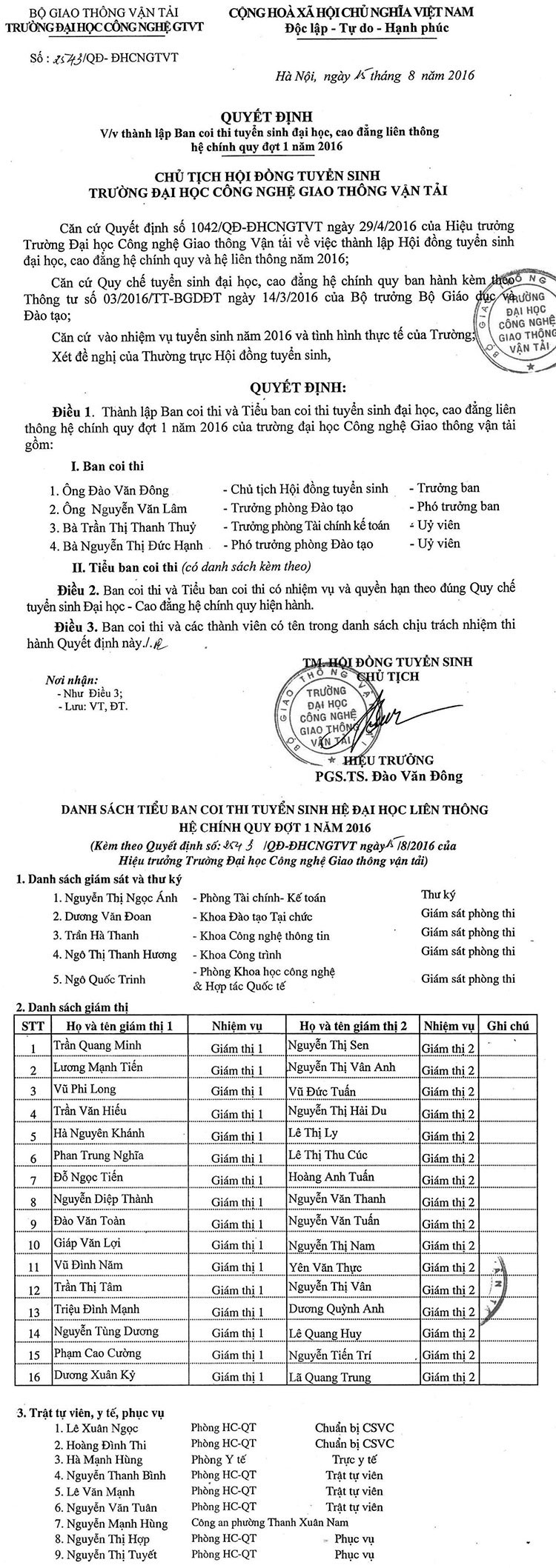 Thông báo thành lập Ban coi thi tuyển sinh đại học, cao đẳng liên thông hệ chính quy đợt 1 năm 2016 15/08/2016 14:08