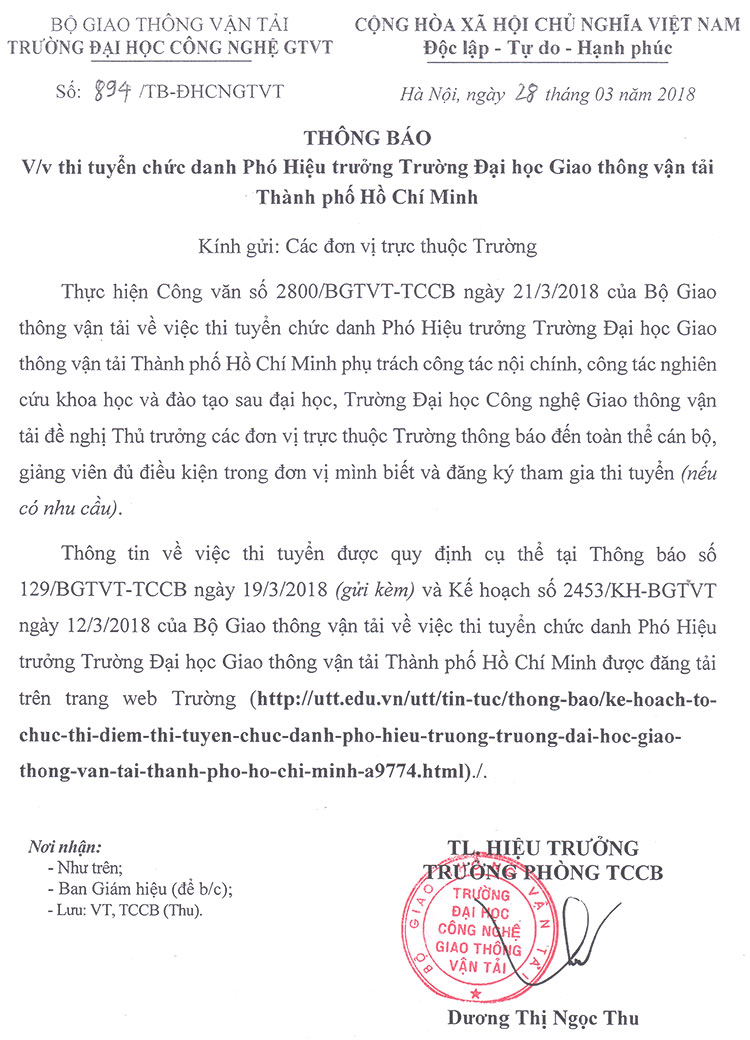 Thông báo thi tuyển chức danh Phó Hiệu trưởng Trường Đại học Giao thông vận tải, Thành phố Hồ Chí Minh 28/03/2018 11:03 File đính kèm 19.03.2018-129.signed.pdf