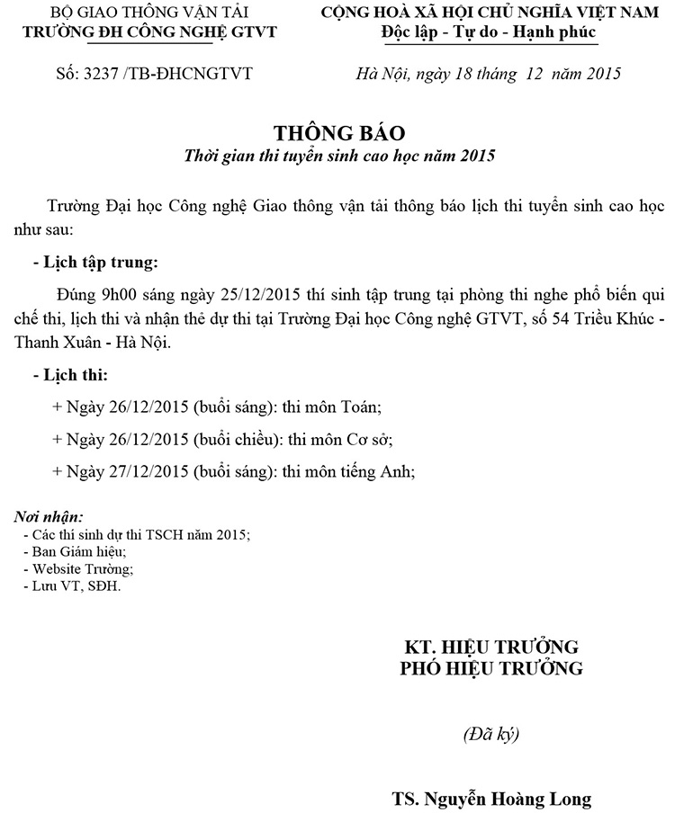 Thông báo Thời gian thi tuyển sinh cao học năm 2015