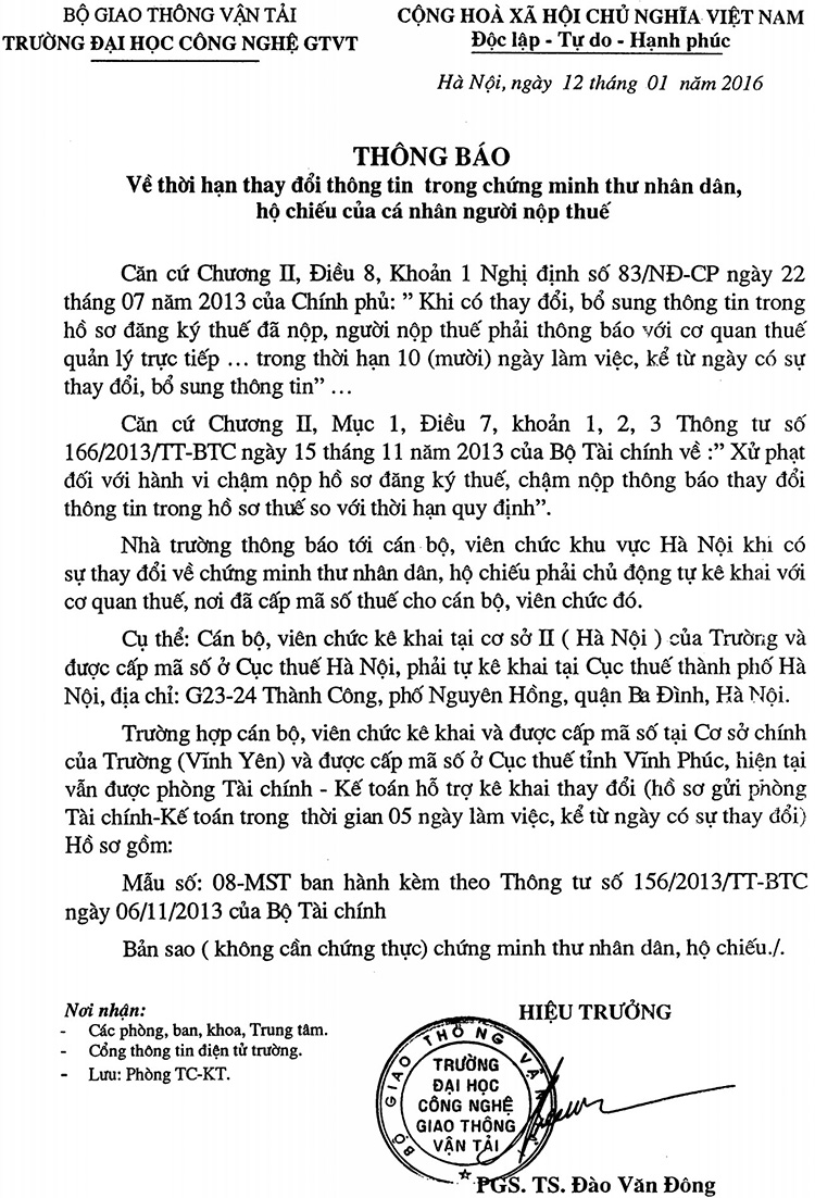 Thông báo thời hạn thay đổi thông tin trong chứng minh thư nhân dân, hộ chiếu của cá nhân người nộp thuế 13/01/2016 00:01 File đính kèm tb-thoi-han-thay-doi-tt-cmtnd-hc-ca-nhan-nguoi-nop-thue.pdf Mau-08-MST.doc Tin liên quan Thông báo về việc đăng ký tham dự Hội thảo “Cùng nhau vươn lên: Kỹ năng lãnh đạo cho tương lai của giáo dục đại học tại Việt Nam và Đông Nam Á” 12/11/2025 Thông báo về việc cập nhật thông tin Căn cước công dân cho người phụ thuộc 30/10/2025 Kế hoạch tổ chức Toạ đàm khoa học “Vai trò của Trí tuệ nhân tạo và công nghệ mới trong nâng cao hiệu quả nghiên cứu lĩnh vực tài chính kế toán” 24/10/2025 Thông báo về việc cử cán bộ tham gia khóa bồi dưỡng tại Học viện Ngoại giao 20/10/2025 Về việc lấy ý kiến góp ý vào dự thảo Quyết định ban hành Quy định về công tác thi đua, khen thưởng của Trường Đại học Công nghệ GTVT 09/10/2025 Thông báo về việc thống kê khối lượng hoạt động phục vụ cộng đồng của giảng viên năm học 2024-2025 02/10/2025