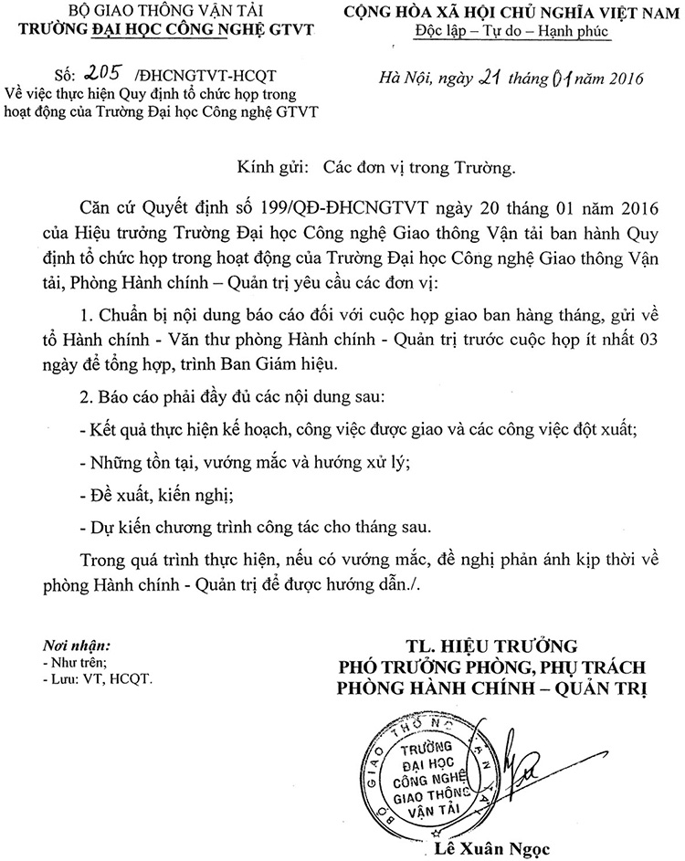 Thông báo thực hiện Quy định tổ chức họp trong hoạt động của Trường Đại học Công nghệ GTVT 22/01/2016 00:01 Xem thêm: Quyết định Ban hành Quy định tổ chức họp trong hoạt động của Trường Đại học Công nghệ Giao thông vận tải