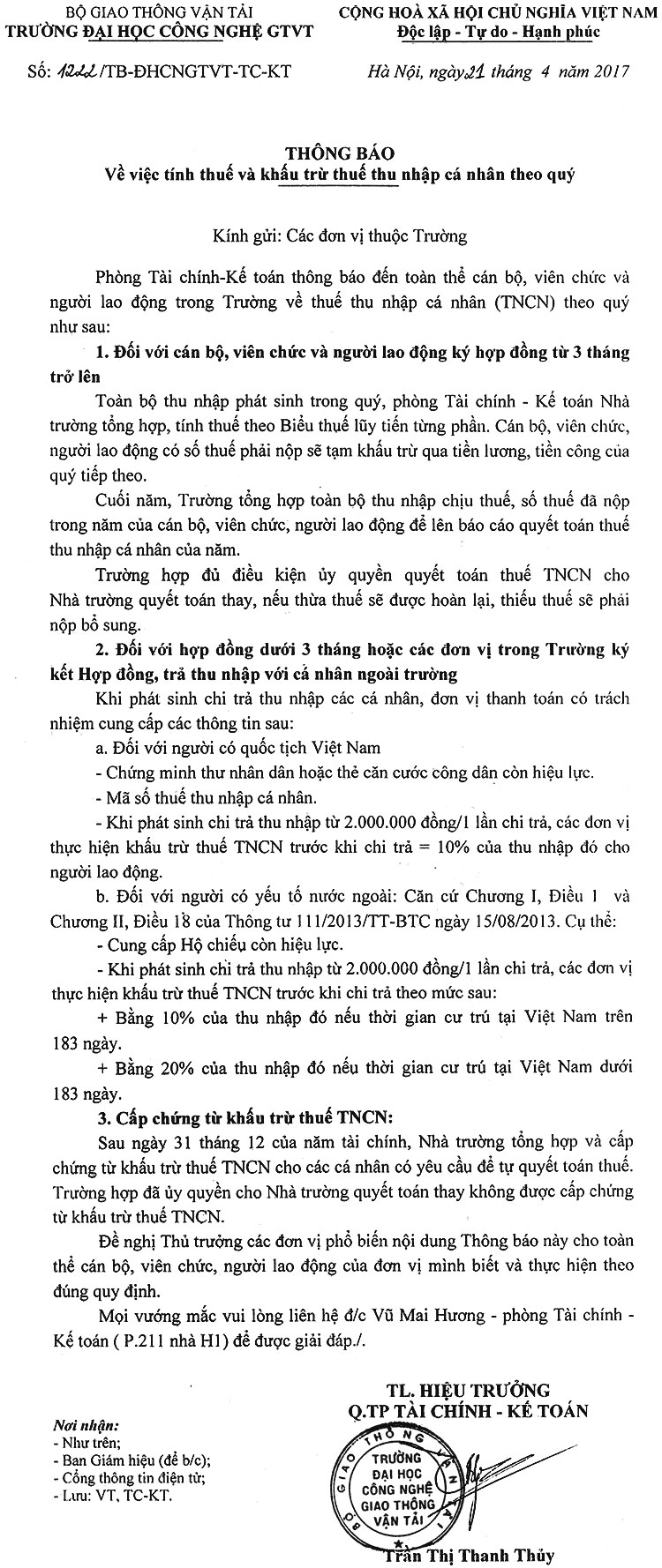 Thông báo tính thuế và khấu trừ thuế thu nhập cá nhân theo quý