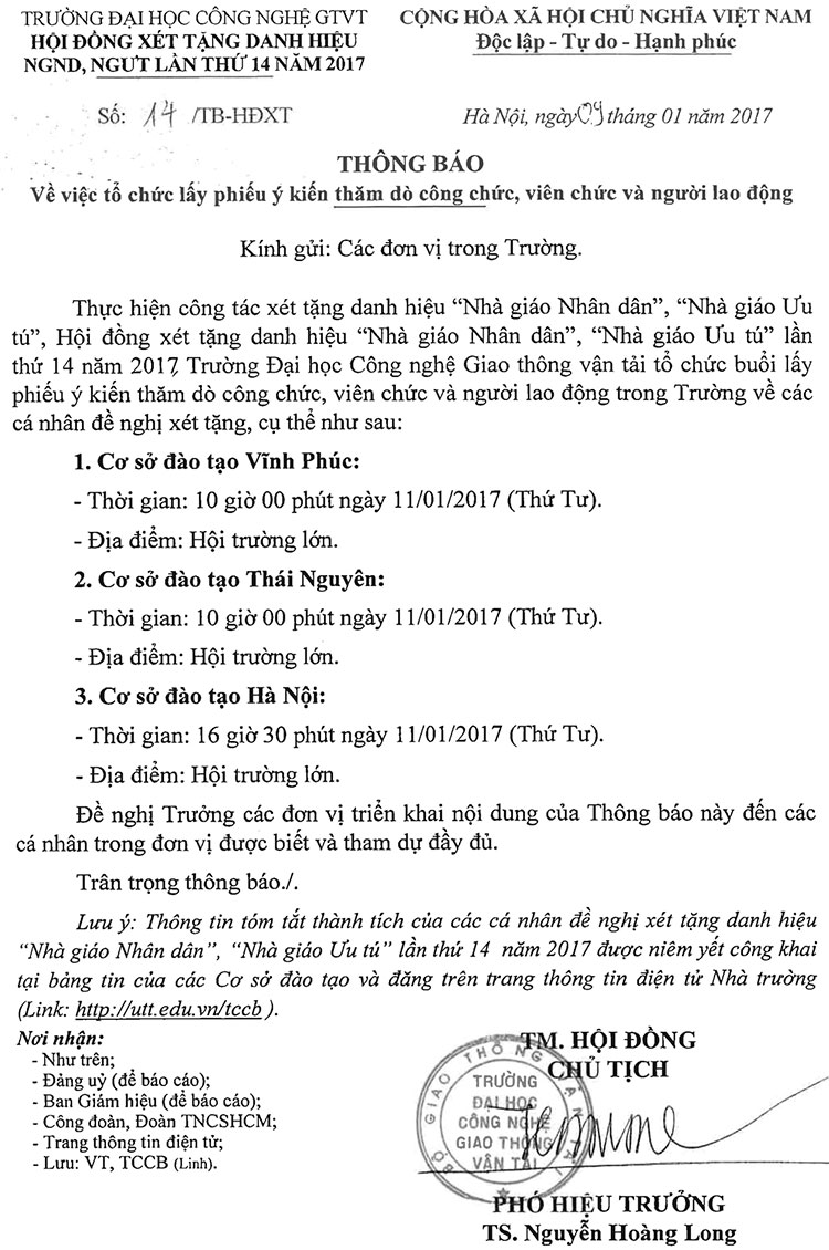 Thông báo Tổ chức buổi lấy phiếu ý kiến thăm dò công chức, viên chức và người lao động về các cá nhân đề nghị xét tặng danh hiệu Nhà giáo Nhân dân, Nhà giáo Ưu tú lần thứ 14 năm 2017