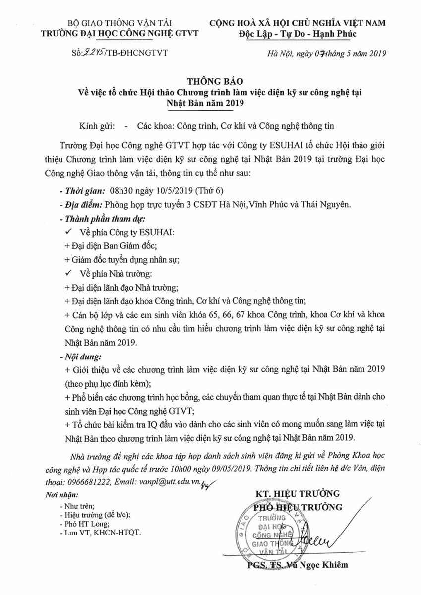 Thông báo tổ chức Hội thảo Chương trình làm việc diện kỹ sư công nghệ tại Nhật Bản năm 2019 08/05/2019 08:05 File đính kèm esuhai-3.jpg esuhai-1.jpg esuhai-2.jpg Tin liên quan Thông báo về việc cập nhật thông tin Căn cước công dân cho người phụ thuộc 30/10/2025 Kế hoạch tổ chức Toạ đàm khoa học “Vai trò của Trí tuệ nhân tạo và công nghệ mới trong nâng cao hiệu quả nghiên cứu lĩnh vực tài chính kế toán” 24/10/2025 Thông báo về việc cử cán bộ tham gia khóa bồi dưỡng tại Học viện Ngoại giao 20/10/2025 Về việc lấy ý kiến góp ý vào dự thảo Quyết định ban hành Quy định về công tác thi đua, khen thưởng của Trường Đại học Công nghệ GTVT 09/10/2025 Thông báo về việc thống kê khối lượng hoạt động phục vụ cộng đồng của giảng viên năm học 2024-2025 02/10/2025 Kê khai khối lượng hoạt động khoa học và công nghệ phục vụ thanh toán khối lượng thừa giờ năm học 2024-2025 01/10/2025