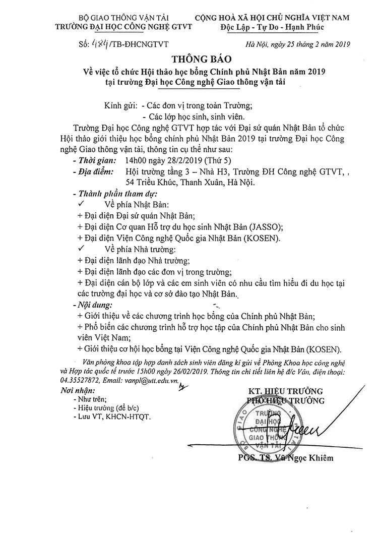 Thông báo tổ chức Hội thảo học bổng Chính phủ Nhật Bản năm 2019 tại UTT