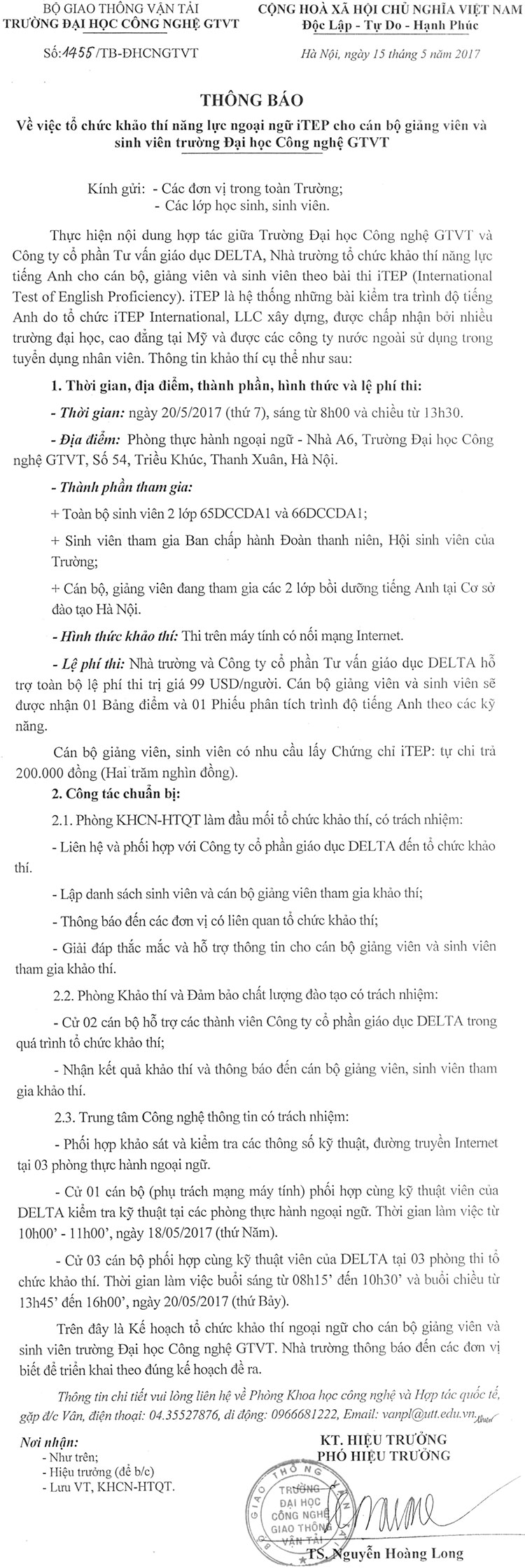 Thông báo Tổ chức khảo thì năng lực ngoại ngữ iTEP cho cán bộ giảng viên và sinh viên Trường Đại học Công nghệ GTVT 15/05/2017 15:05