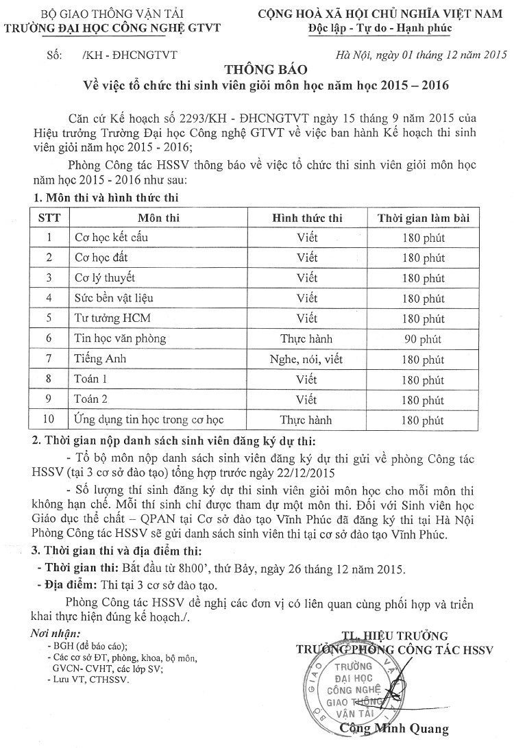 Thông báo Tổ chức thi sinh viên giỏi môn học năm học 2015 - 2016