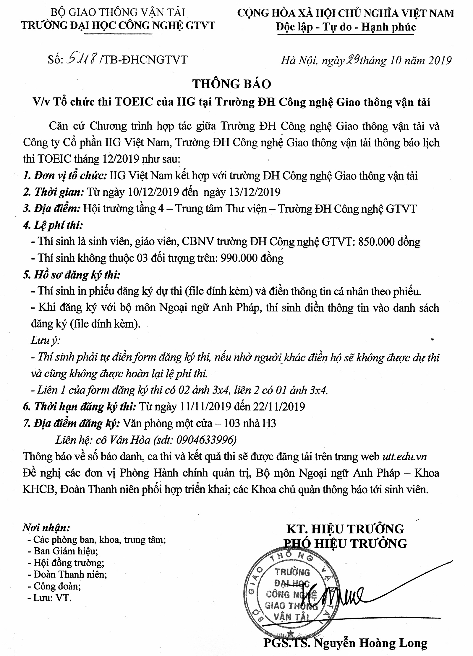 Thông báo Tổ chức thi TOEIC của IIG tại Trường Đại học Công nghệ GTVT 30/10/2019 08:10 File đính kèm Danh-sach-DK-thi-ITP---TOEIC.xls Phieu-dang-ky-TOEIC.xlsx Tin liên quan Thông báo về việc cập nhật thông tin Căn cước công dân cho người phụ thuộc 30/10/2025 Kế hoạch tổ chức Toạ đàm khoa học “Vai trò của Trí tuệ nhân tạo và công nghệ mới trong nâng cao hiệu quả nghiên cứu lĩnh vực tài chính kế toán” 24/10/2025 Thông báo về việc cử cán bộ tham gia khóa bồi dưỡng tại Học viện Ngoại giao 20/10/2025 Về việc lấy ý kiến góp ý vào dự thảo Quyết định ban hành Quy định về công tác thi đua, khen thưởng của Trường Đại học Công nghệ GTVT 09/10/2025 Thông báo về việc thống kê khối lượng hoạt động phục vụ cộng đồng của giảng viên năm học 2024-2025 02/10/2025 Kê khai khối lượng hoạt động khoa học và công nghệ phục vụ thanh toán khối lượng thừa giờ năm học 2024-2025 01/10/2025