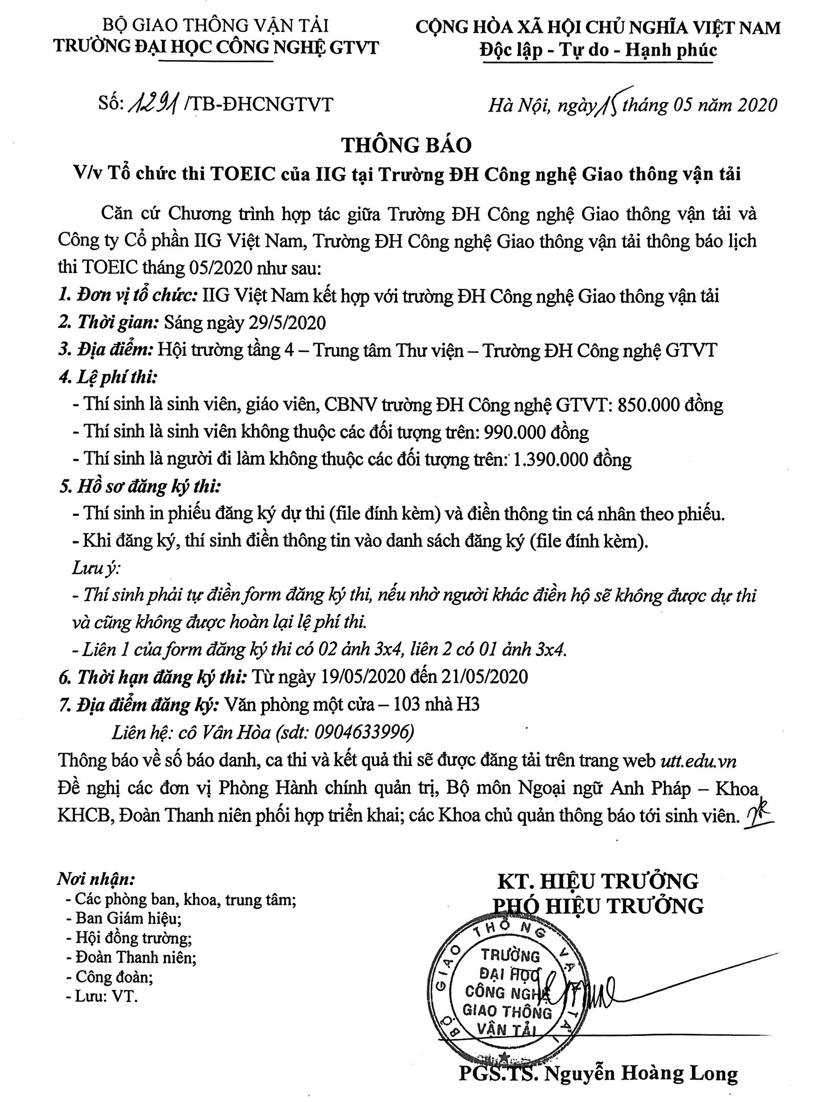 Thông báo Tổ chức thi TOEIC của IIG tại Trường Đại học Công nghệ GTVT 16/05/2020 08:05 File đính kèm Danh-sach-DK-thi-ITP---TOEIC.xls PhieuDangKy_TOEIC.xlsx Tin liên quan Thông báo về việc cập nhật thông tin Căn cước công dân cho người phụ thuộc 30/10/2025 Kế hoạch tổ chức Toạ đàm khoa học “Vai trò của Trí tuệ nhân tạo và công nghệ mới trong nâng cao hiệu quả nghiên cứu lĩnh vực tài chính kế toán” 24/10/2025 Thông báo về việc cử cán bộ tham gia khóa bồi dưỡng tại Học viện Ngoại giao 20/10/2025 Về việc lấy ý kiến góp ý vào dự thảo Quyết định ban hành Quy định về công tác thi đua, khen thưởng của Trường Đại học Công nghệ GTVT 09/10/2025 Thông báo về việc thống kê khối lượng hoạt động phục vụ cộng đồng của giảng viên năm học 2024-2025 02/10/2025 Kê khai khối lượng hoạt động khoa học và công nghệ phục vụ thanh toán khối lượng thừa giờ năm học 2024-2025 01/10/2025