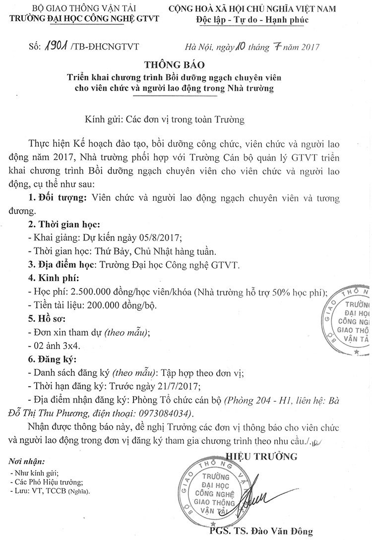 Thông báo Triển khai chương trình Bồi dưỡng ngạch chuyên viên cho viên chức và người lao động trong Nhà trường 10/07/2017 14:07 File đính kèm Thong-bao-dang-ky-hoc-Boi-duong-chuyen-vien.doc Mau-Danh-sach-dang-ky-Boi-duong-chuyen-vien.doc Tin liên quan Kế hoạch tổ chức Toạ đàm khoa học “Vai trò của Trí tuệ nhân tạo và công nghệ mới trong nâng cao hiệu quả nghiên cứu lĩnh vực tài chính kế toán” 24/10/2025 Thông báo về việc cử cán bộ tham gia khóa bồi dưỡng tại Học viện Ngoại giao 20/10/2025 Về việc lấy ý kiến góp ý vào dự thảo Quyết định ban hành Quy định về công tác thi đua, khen thưởng của Trường Đại học Công nghệ GTVT 09/10/2025 Thông báo về việc thống kê khối lượng hoạt động phục vụ cộng đồng của giảng viên năm học 2024-2025 02/10/2025 Kê khai khối lượng hoạt động khoa học và công nghệ phục vụ thanh toán khối lượng thừa giờ năm học 2024-2025 01/10/2025 Tổ chức lớp bồi dưỡng nghiệp vụ sư phạm và bồi dưỡng tiêu chuẩn chức danh nghề nghiệp giảng viên đại học 01/10/2025