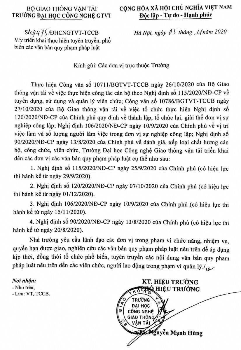 Thông báo triển khai thực hiện tuyên truyền, phổ biến các văn bản quy phạm pháp luật 05/11/2020 04:11 File đính kèm 90.signed.pdf 106.signed.pdf 120.signed.pdf 115.signed.pdf Tin liên quan Thông báo về việc cập nhật thông tin Căn cước công dân cho người phụ thuộc 30/10/2025 Kế hoạch tổ chức Toạ đàm khoa học “Vai trò của Trí tuệ nhân tạo và công nghệ mới trong nâng cao hiệu quả nghiên cứu lĩnh vực tài chính kế toán” 24/10/2025 Thông báo về việc cử cán bộ tham gia khóa bồi dưỡng tại Học viện Ngoại giao 20/10/2025 Về việc lấy ý kiến góp ý vào dự thảo Quyết định ban hành Quy định về công tác thi đua, khen thưởng của Trường Đại học Công nghệ GTVT 09/10/2025 Thông báo về việc thống kê khối lượng hoạt động phục vụ cộng đồng của giảng viên năm học 2024-2025 02/10/2025 Kê khai khối lượng hoạt động khoa học và công nghệ phục vụ thanh toán khối lượng thừa giờ năm học 2024-2025 01/10/2025 Tin nổi bật UTT Awards 2025: Khi người học nói lời tri ân những người Tận tâm- Tận hiến vì UTT 29/10/2025 14:10 UTT ra mắt Mạng lưới trung tâm đào tạo xuất sắc và tài năng trong lĩnh vực Công nghệ giao thông và Hạ tầng tiên... 10/10/2025 13:10 Thông tin mới nhất Đại hội Hội Cựu chiến binh Trường Đại học Công nghệ Giao thông vận tải nhiệm kỳ 2025–2030 thành công tốt đẹp 04/11/2025 15:11 Sinh viên chuyên ngành Trí tuệ nhân tạo & Giao thông thông minh UTT: Kiến tạo tương lai cùng doanh nghiệp 04/11/2025 08:11 Vượt lên nghịch cảnh, em Trần Văn Dũng viết tiếp ước mơ khi đến với Trường Đại học Công nghệ GTVT 03/11/2025 14:11 UTT thúc đẩy hợp tác với các đối tác Úc trong đào tạo, nghiên cứu và hỗ trợ sinh viên 30/10/2025 15:10 Thông báo về việc cập nhật thông tin Căn cước công dân cho người phụ thuộc 30/10/2025 15:10