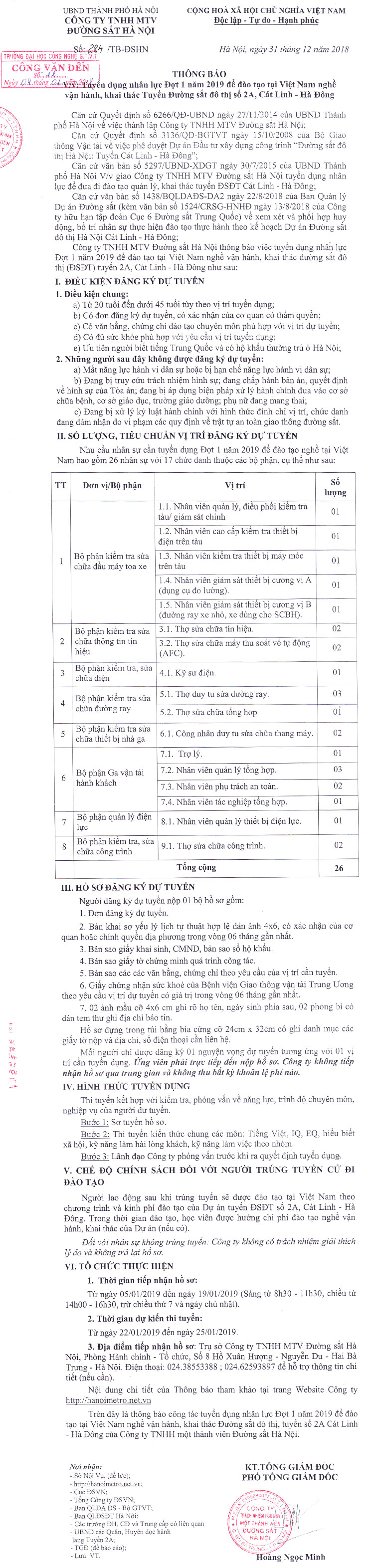 Thông báo Tuyển dụng nhân lực Đợt 1 năm 2019 để đào tạo tại Việt Nam nghề vận hành, khai thác Tuyến Đường sắt đô thị số 2A, Cát Linh - Hà Đông 05/01/2019 11:01 File đính kèm phu-luc.pdf