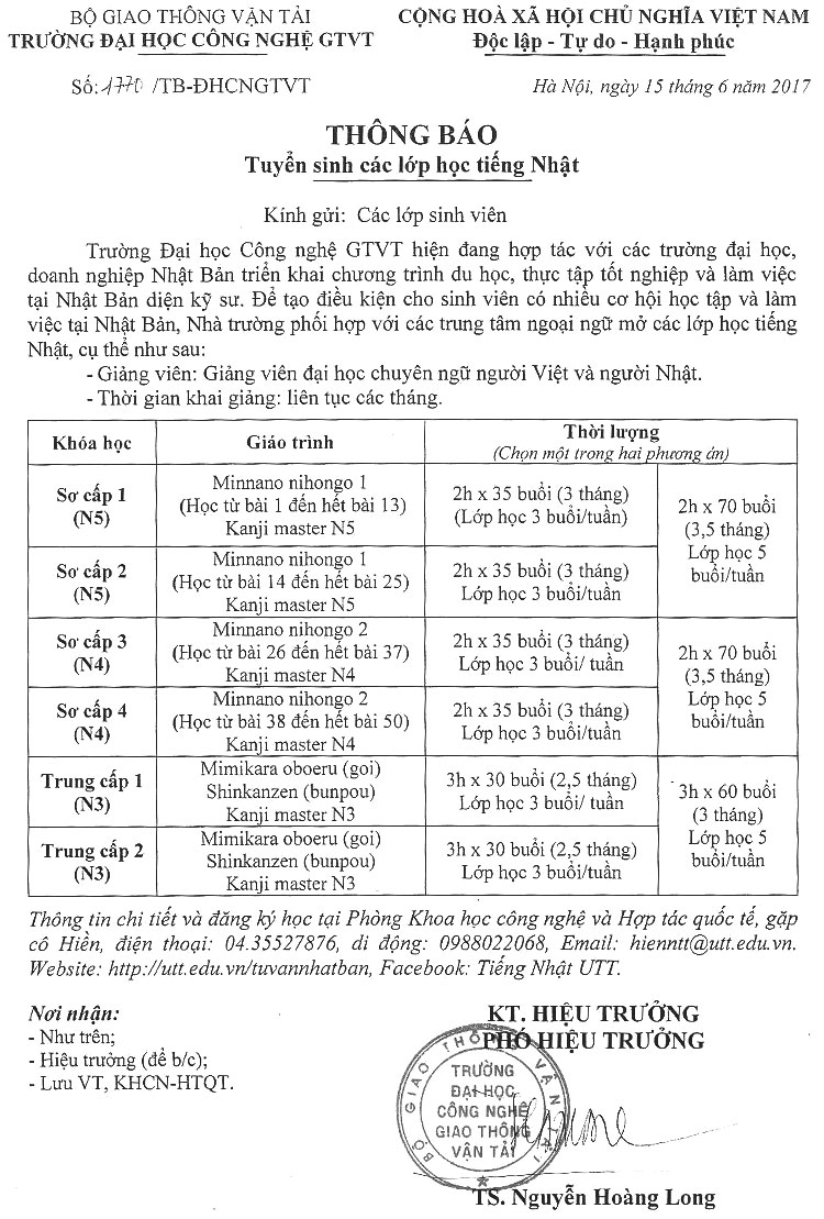 Thông báo Tuyển sinh các lớp học tiếng Nhật năm học 2017 - 2018