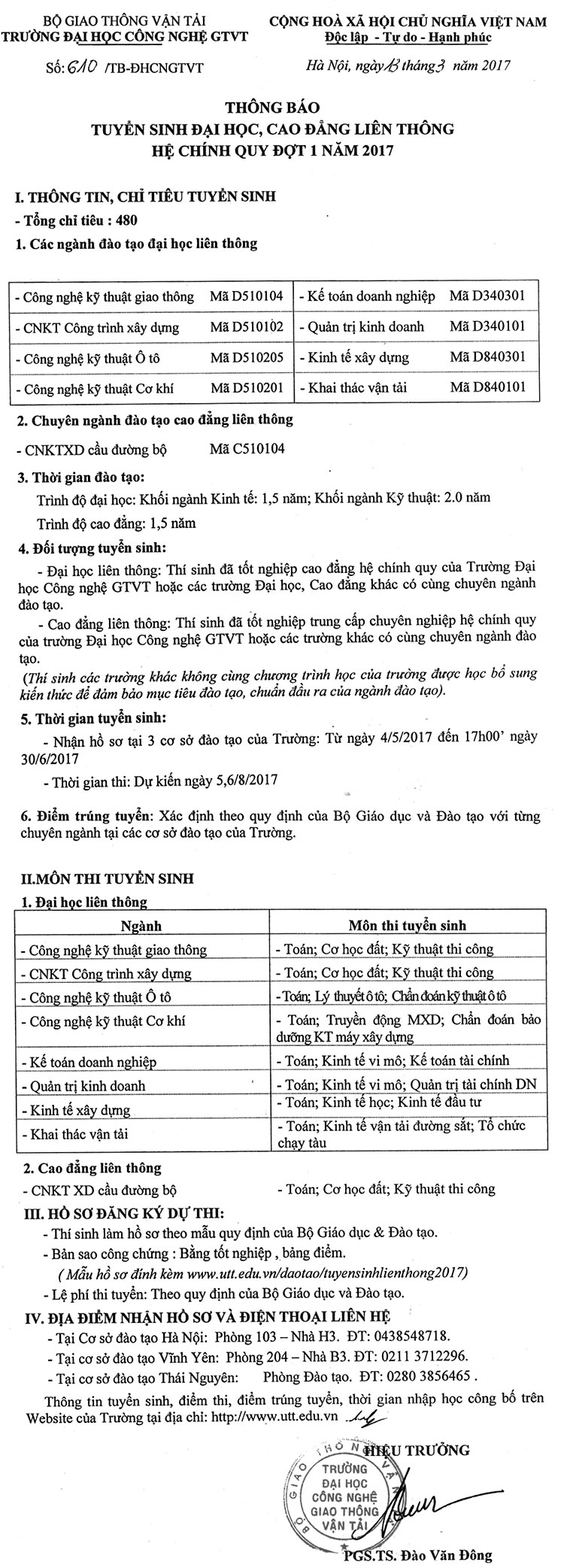 Thông báo Tuyển sinh Đại học, Cao đẳng liên thông hệ Chính quy đợt 1 năm 2017